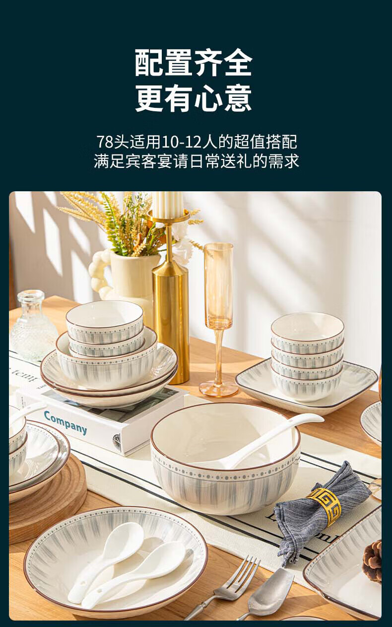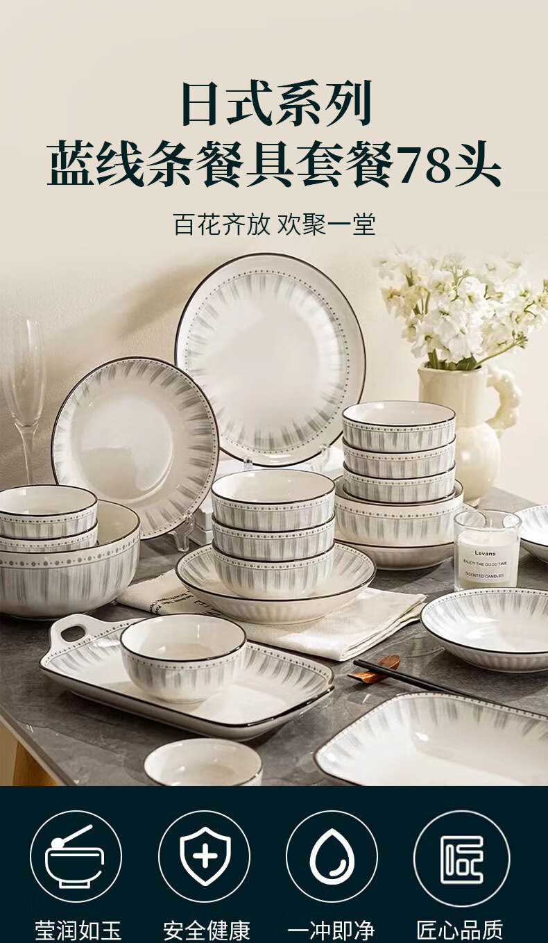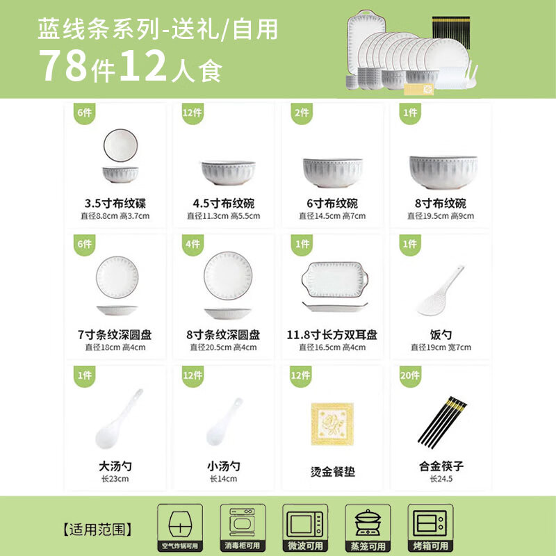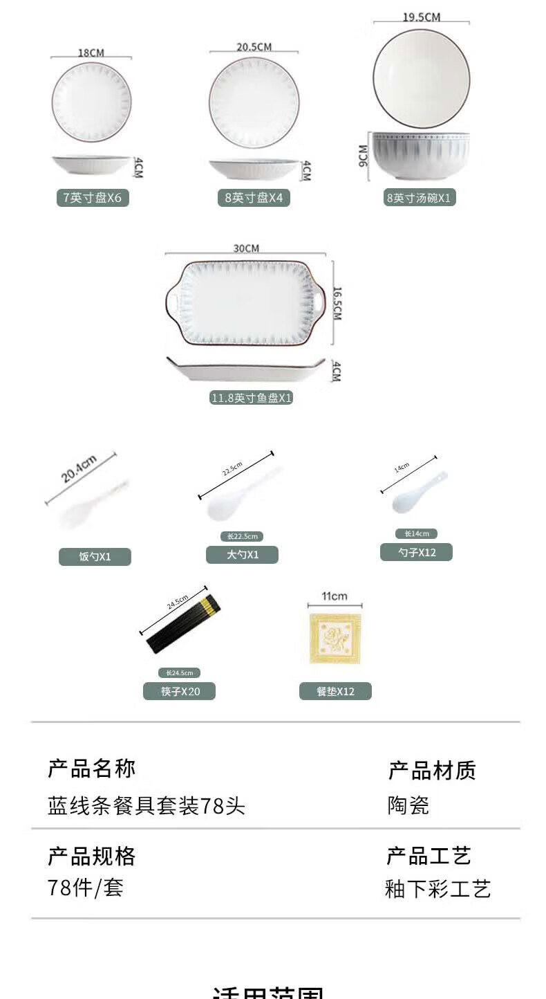 • 商品名称:佩尔森日式陶瓷碗盘餐具整套釉下彩碗盘筷餐具套装家用乔迁 蓝线条78头 餐具套装/套