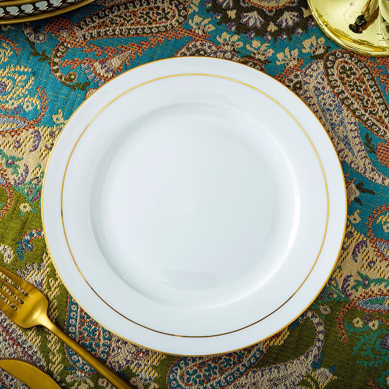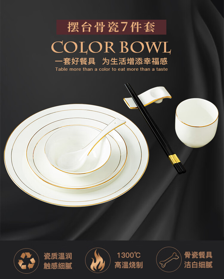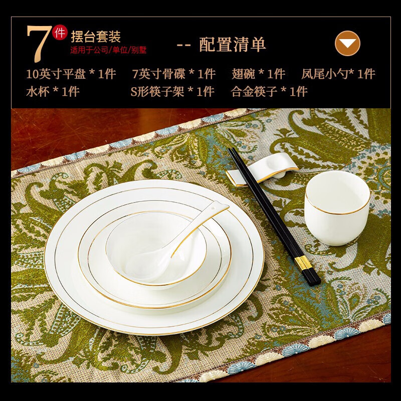 • 商品名称:陶相惠陶瓷餐具套装酒店摆台碗盘勺7件套碗碟套装高档餐厅骨瓷餐具定制 金边摆台-7件套/套