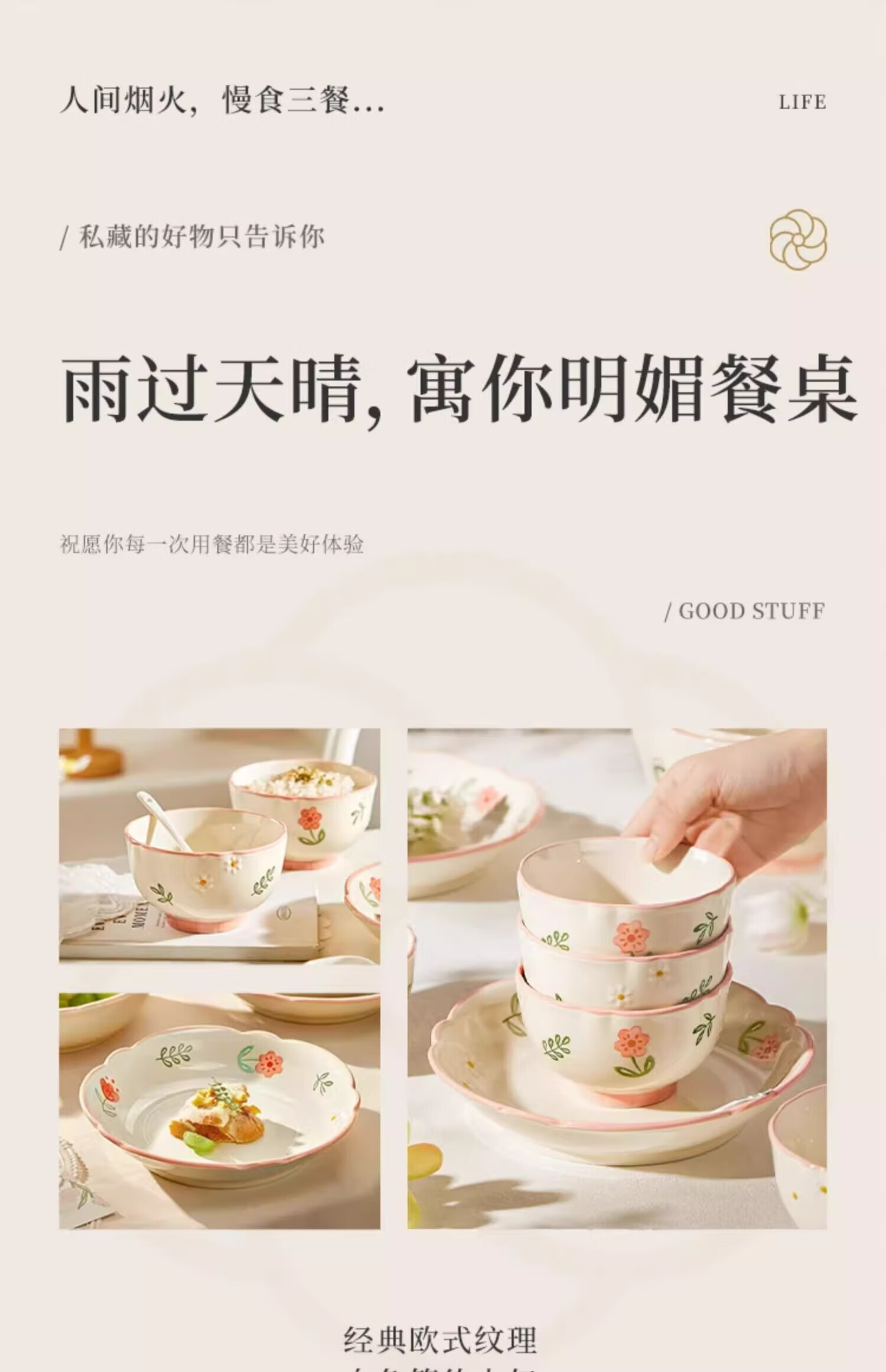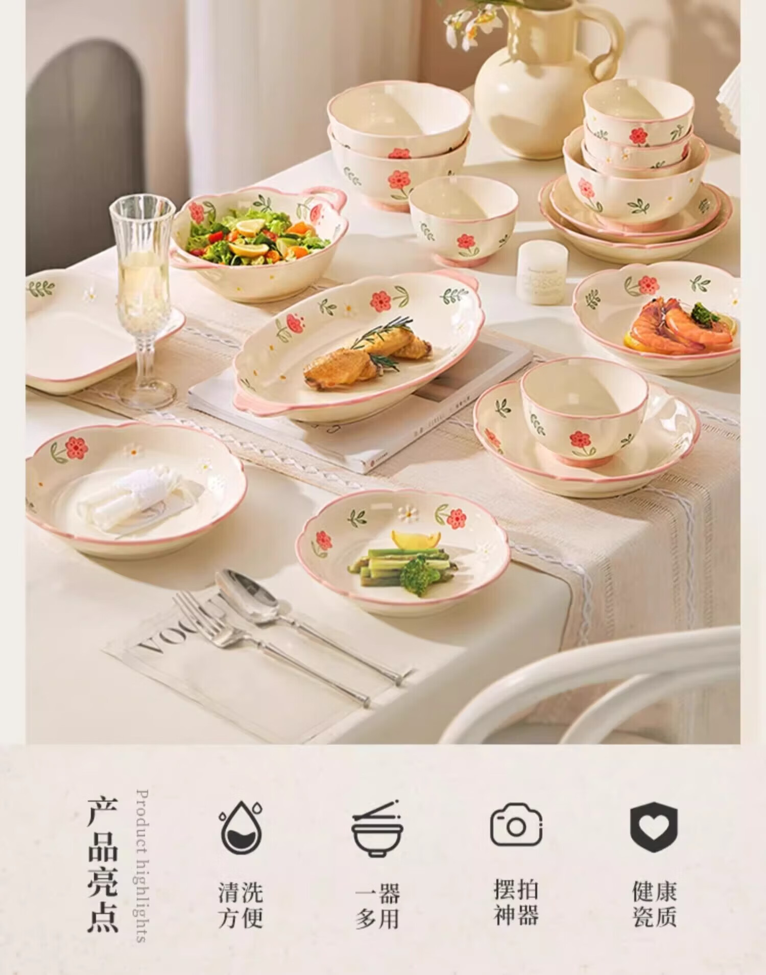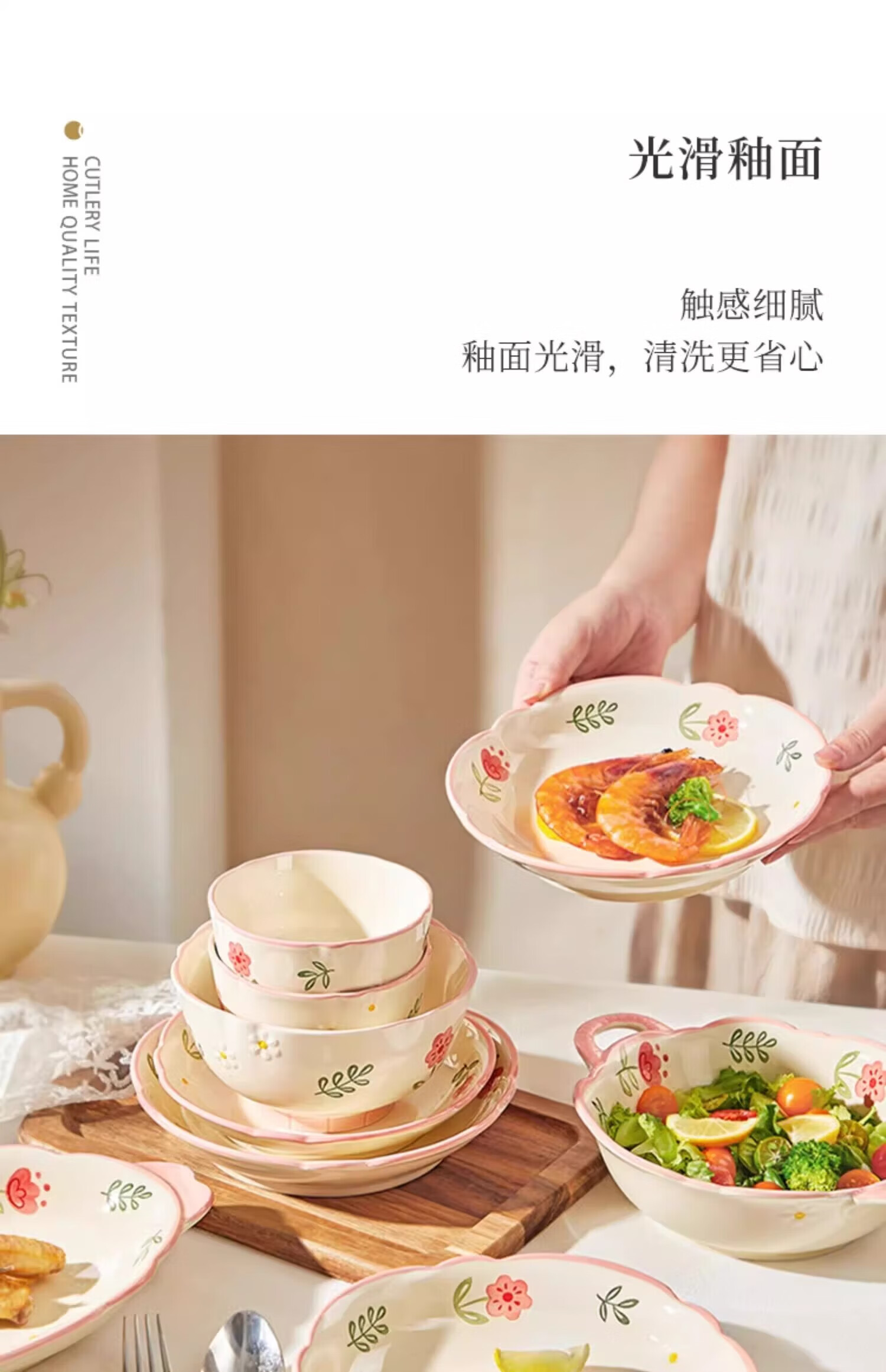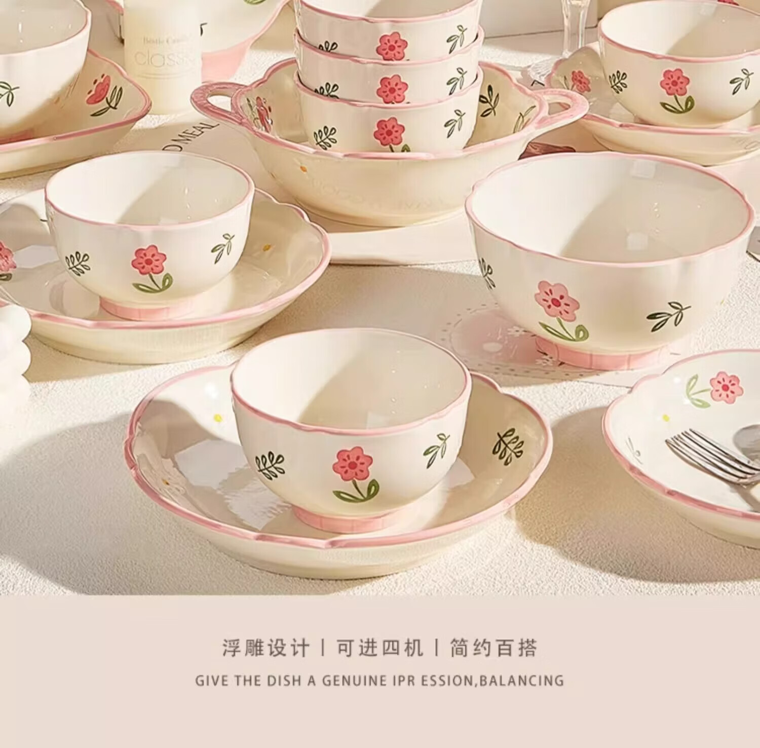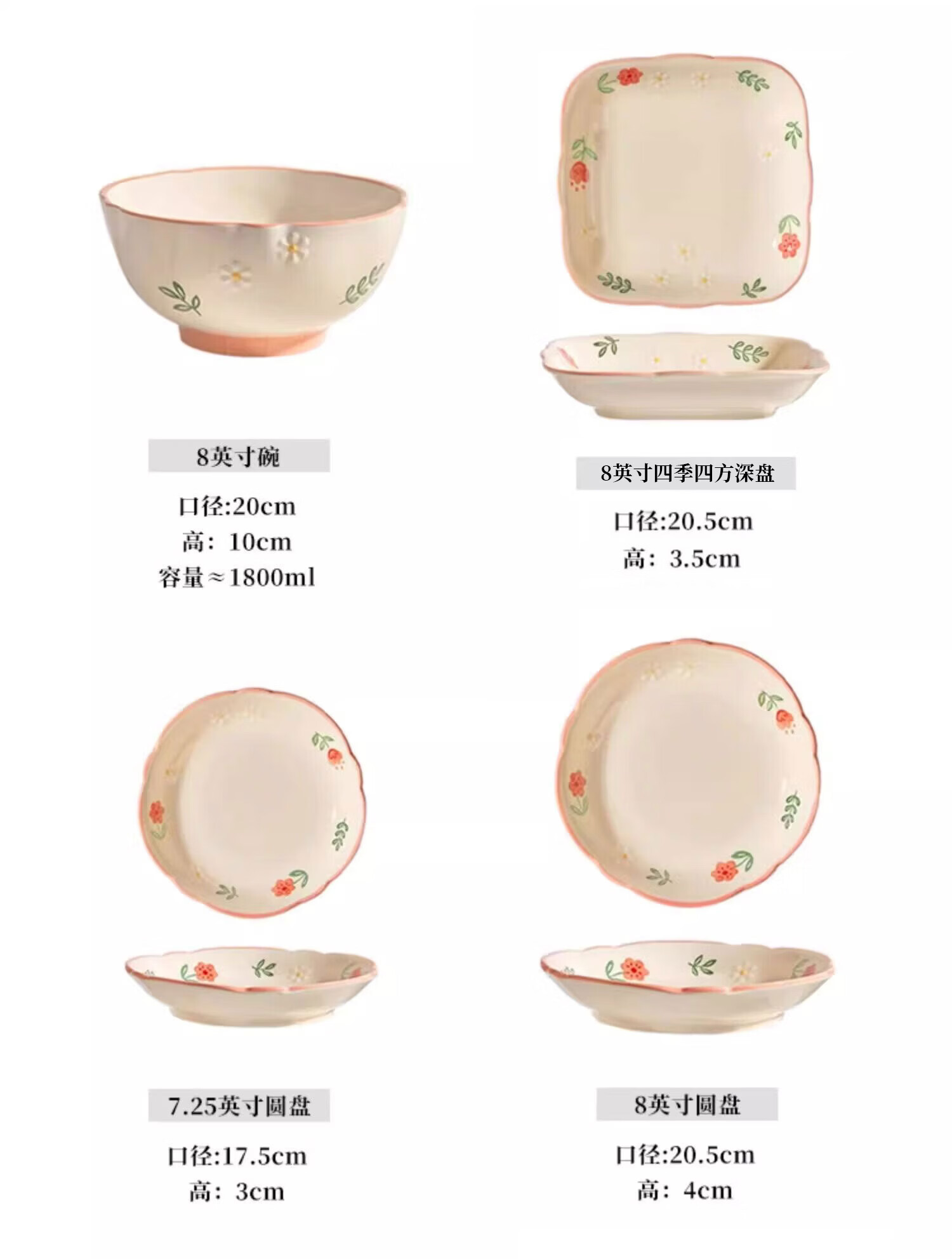 包装清单: 4寸四季碟/晴天*4、8寸四季四方深盘/晴天*1、12.5寸四季鱼盘/晴天*1、4.5寸碗/晴天*8、8寸碗/晴天*1、7.25寸圆盘/晴天*2、8寸圆盘/晴天*2、5寸小汤勺*8、大汤勺*1、合金筷子*8、几何套装礼盒*1