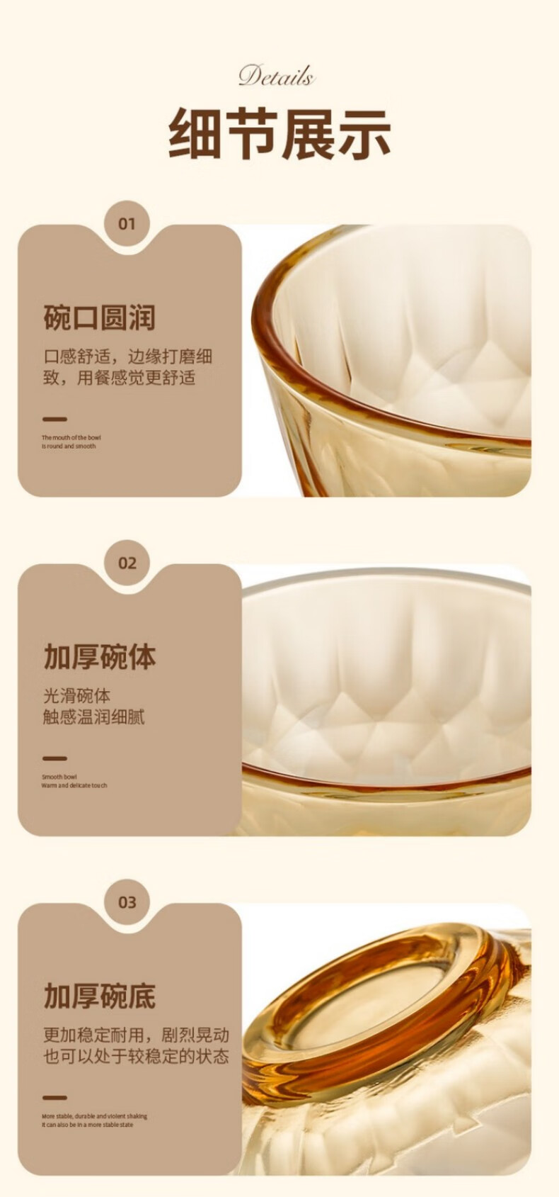 • 商品名称:希乐扣Cilock玻璃碗盘 高硼硅耐高温可微波 水果碗汤碗菜碗面碗家用饭碗 2只装 琥珀色钻石碗小号2只/只