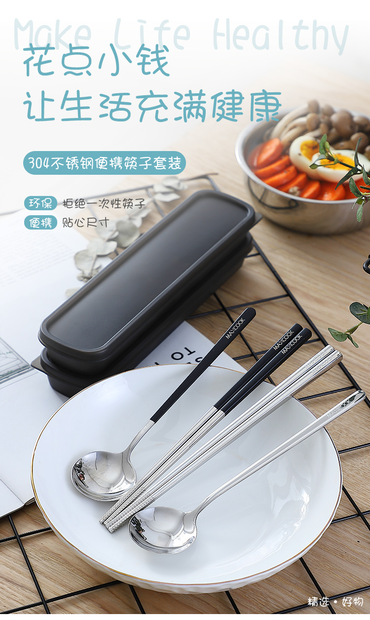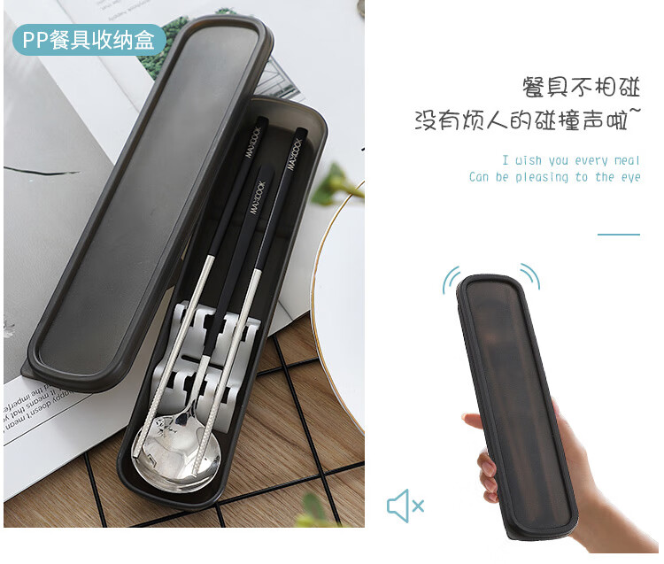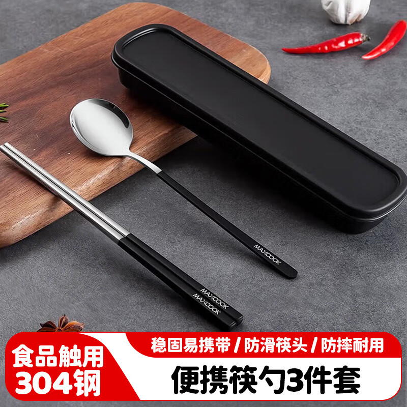 美厨(MAXCOOK)304不锈钢筷子勺子餐具套装 创意便携式筷勺三件套黑色 MCGC850 304不锈钢筷子勺子/套