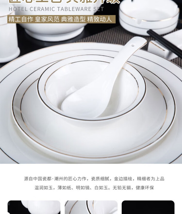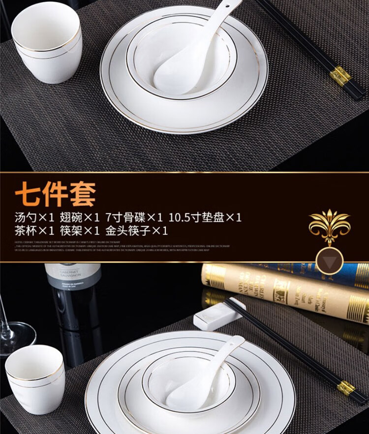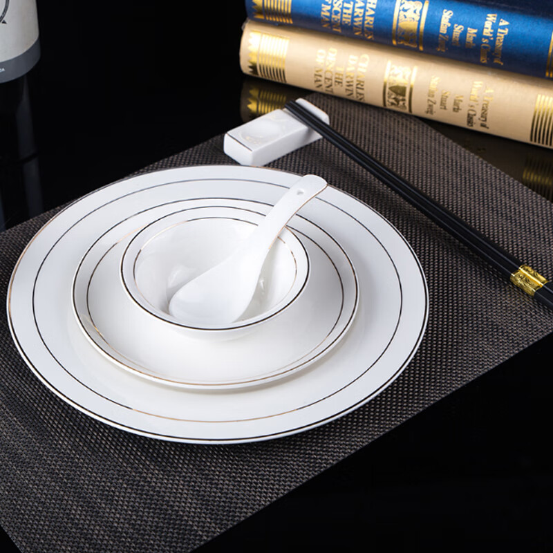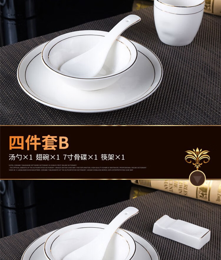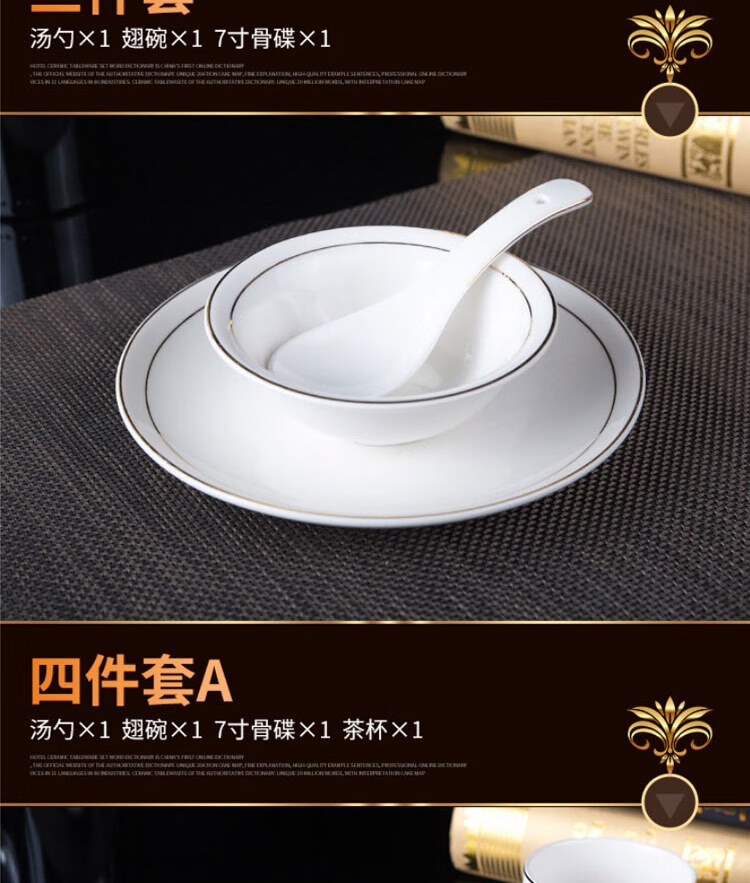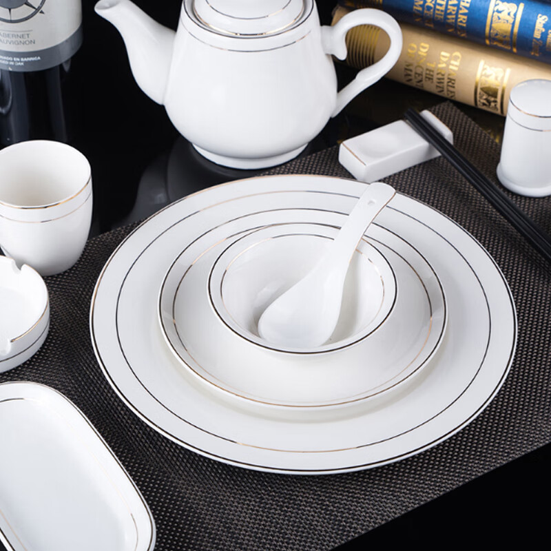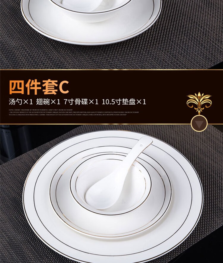 • 商品名称:敏奈 陶瓷金边摆台餐具 酒店餐具金线餐具套装盘碗碟 汤勺 摆台餐具/个