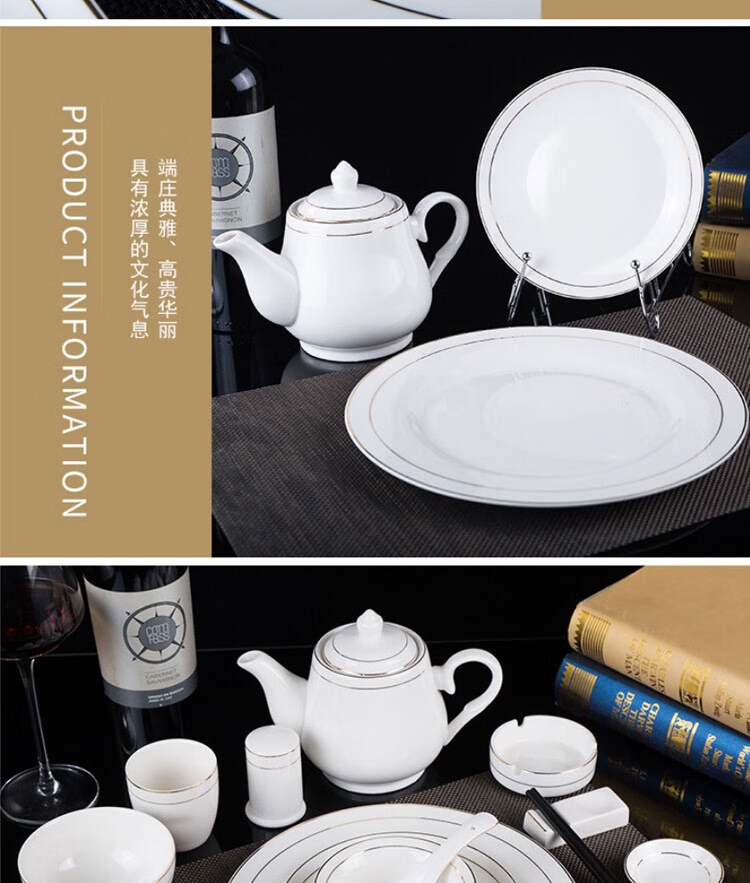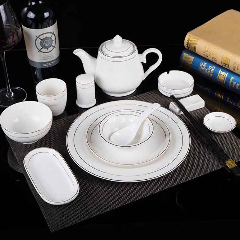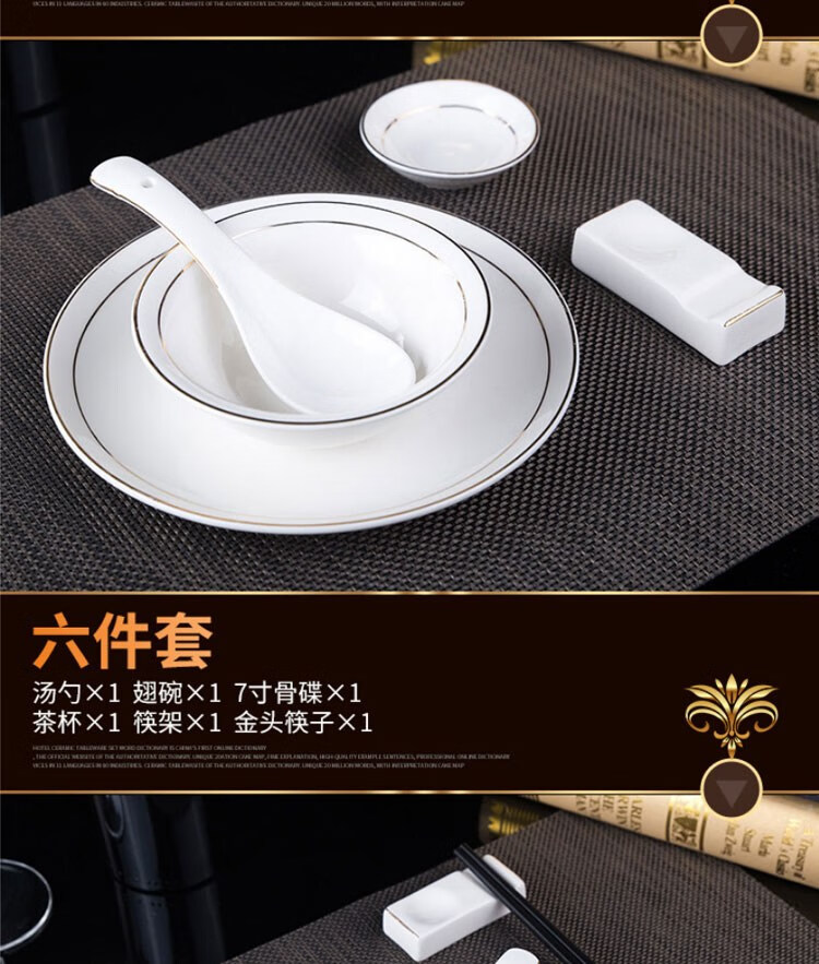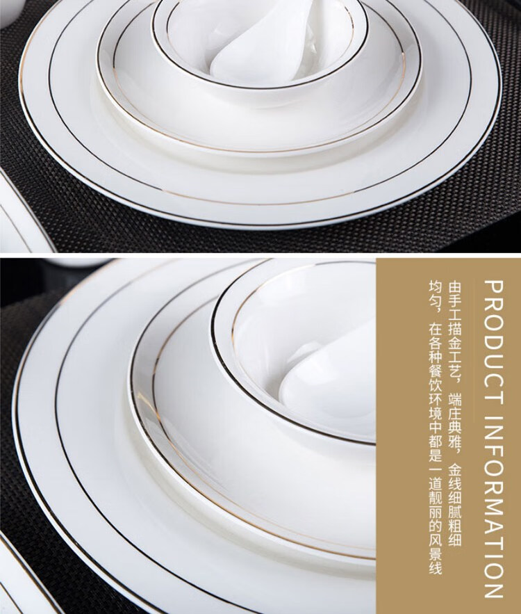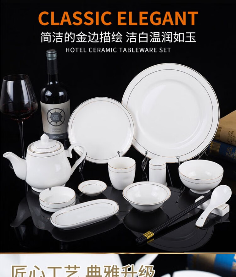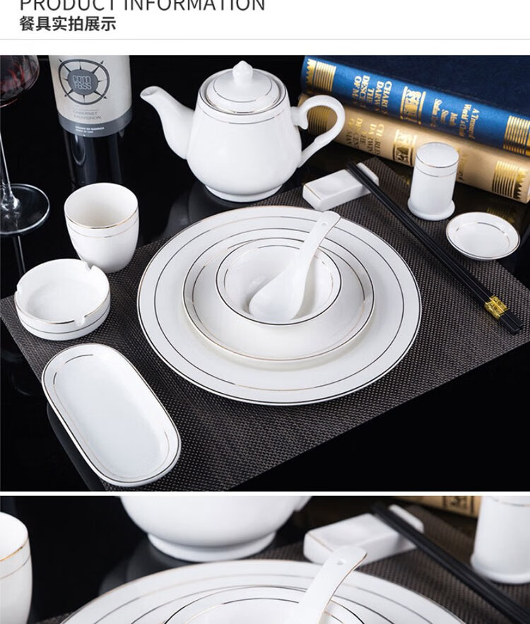 • 商品名称:敏奈 陶瓷金边摆台餐具 酒店餐具金线餐具套装盘碗碟 汤勺 摆台餐具/个