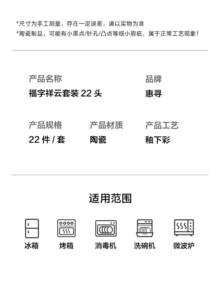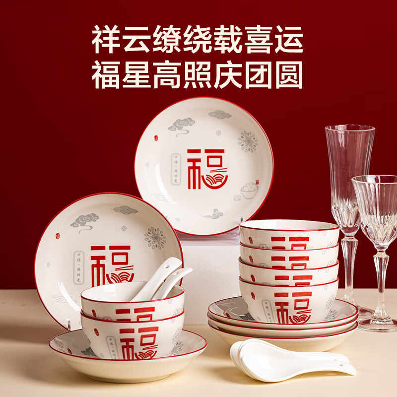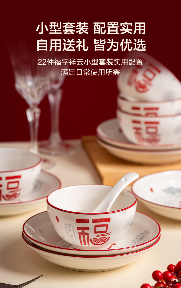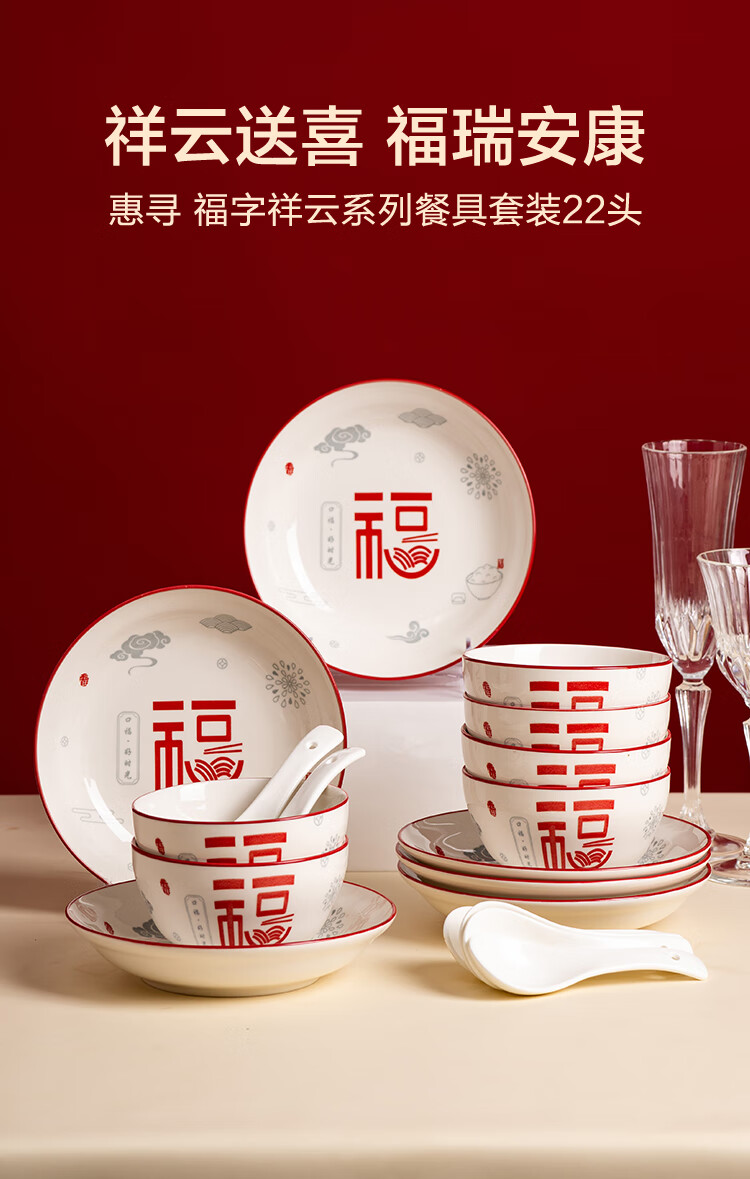 • 商品名称:惠寻 碗盘餐具整套 釉下彩家用陶瓷碗碟筷子餐具套装 福字祥云22头 22件套福字祥云/套