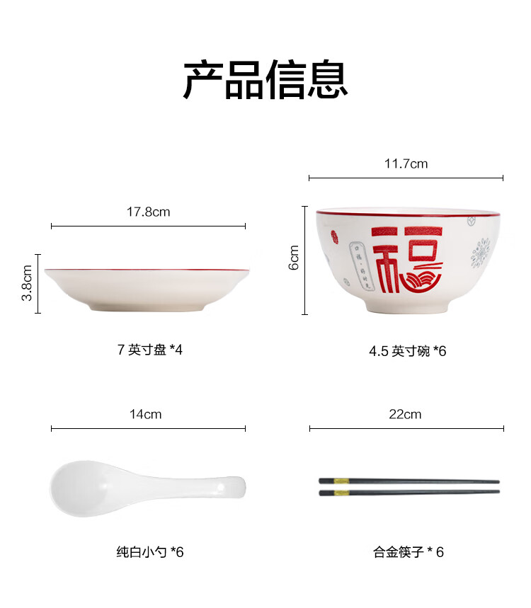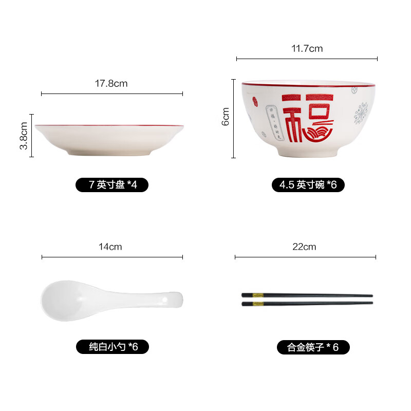 包装清单: 4.5英寸碗*6 合金筷子*6 7英寸盘*4 纯白小勺*6