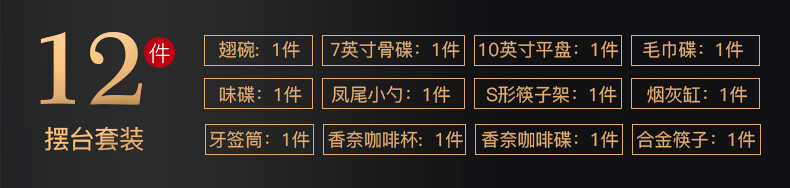 包装清单: 10寸平盘*1、7寸骨碟*1、翅碗*1、小勺*1、水杯*1、毛巾碟*1、烟灰缸*1、筷子架*1 味碟*1 香奈咖啡杯*1 香奈咖啡碟*1 合金筷子*1