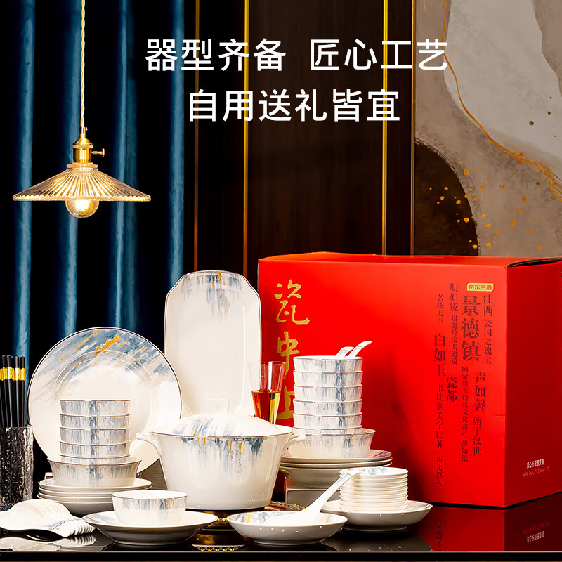京东京造 碗盘餐具整套 碗碟子套装乔迁之喜陶瓷家用礼盒装 清梦星河62头 JZ-cg089/套
