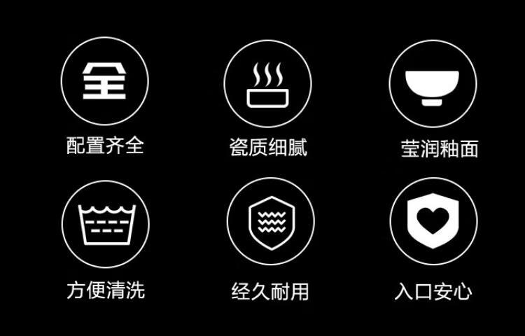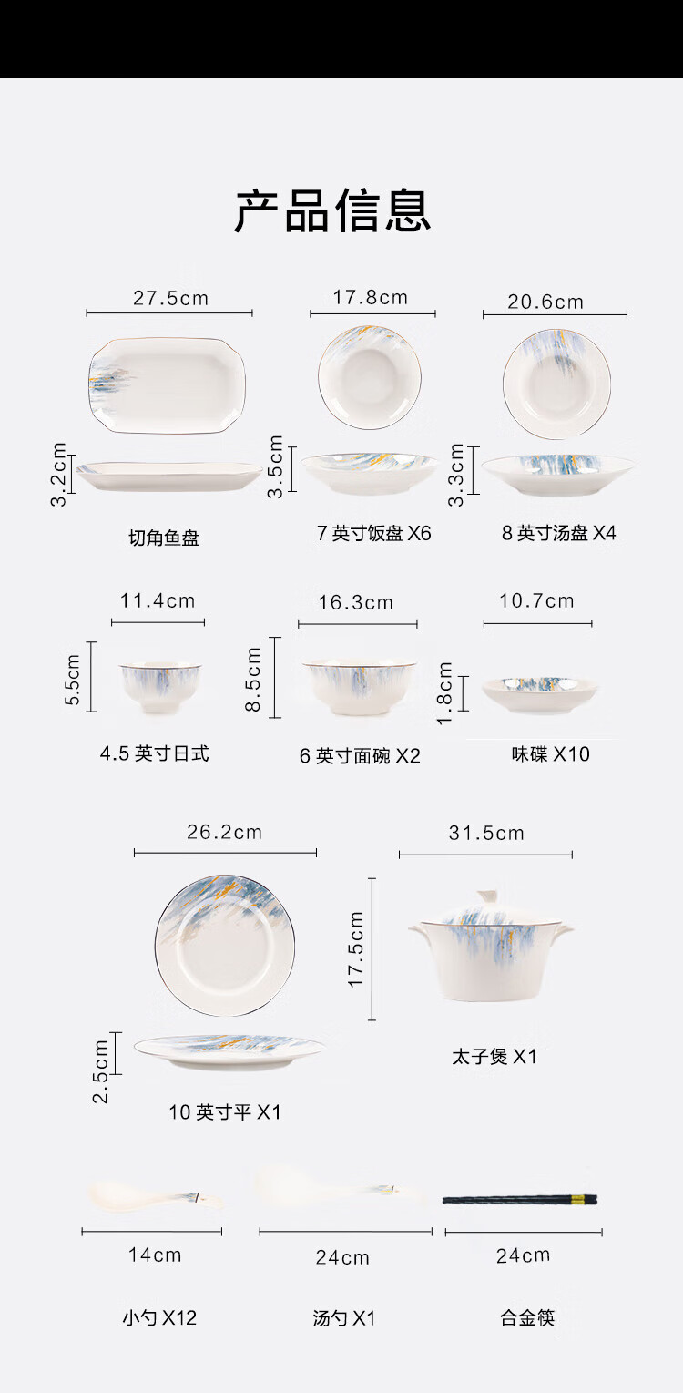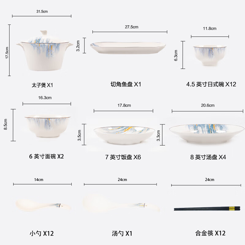 包装清单: 太子煲*1;切角鱼盘*1;10寸平*1;6寸面碗*2;汤勺*1;小勺*12;7寸饭盘*6;8寸汤盘*4;合金筷*12;4.5寸日式碗*12;味碟*10
