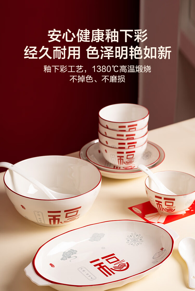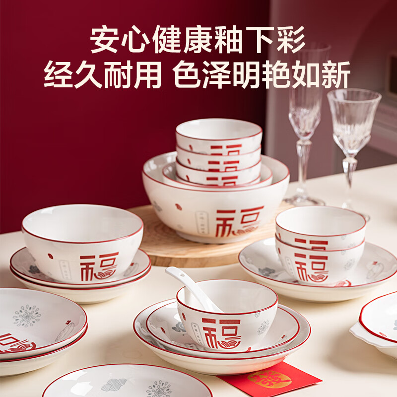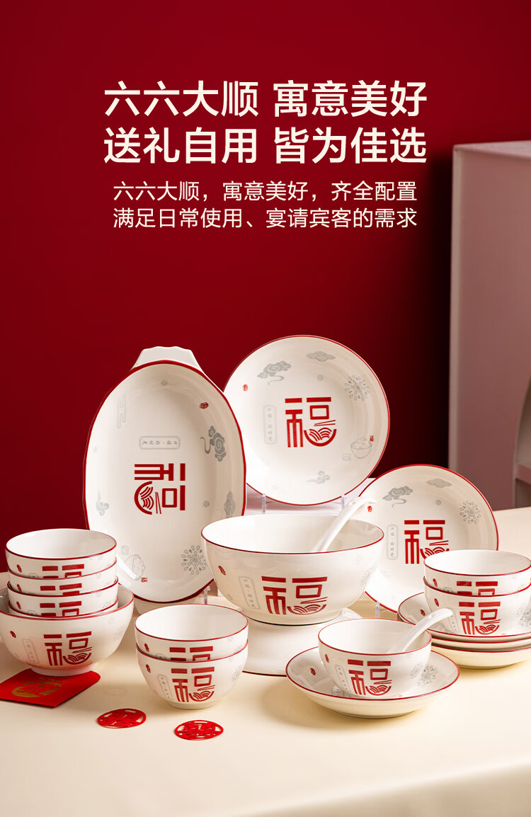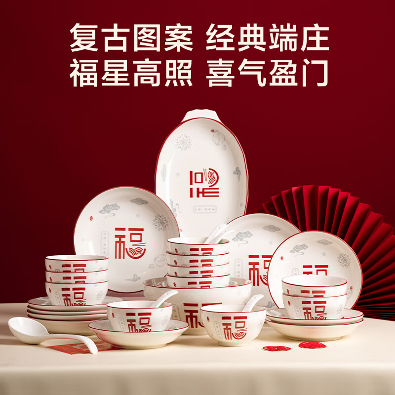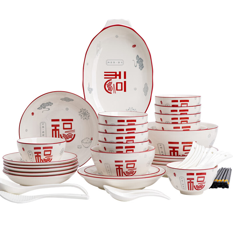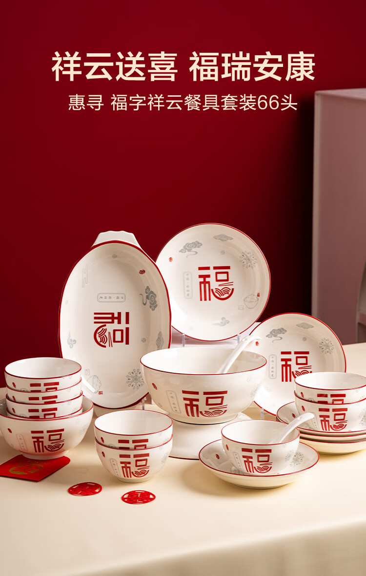 惠寻京东自有品牌 66件套福字祥云釉下彩家用餐具套装 66件套福字祥云/套