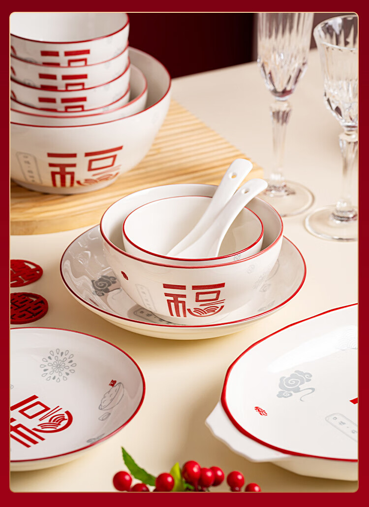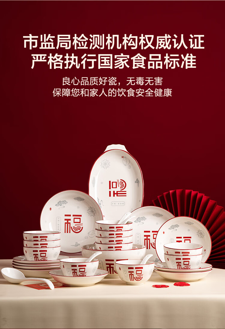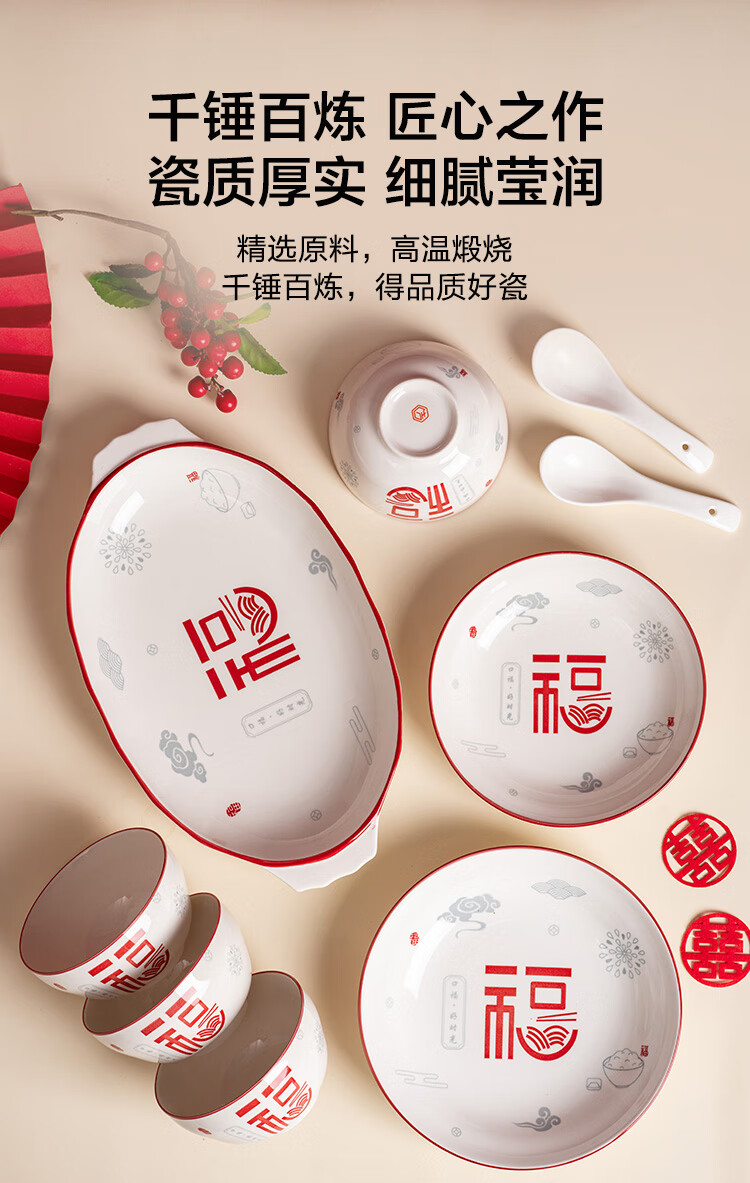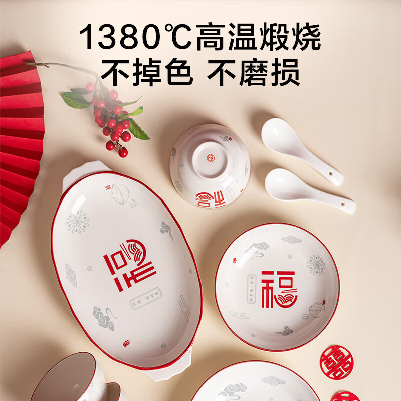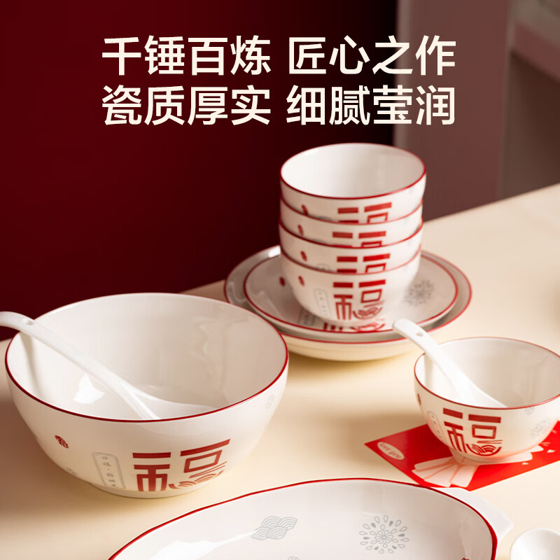 惠寻京东自有品牌 66件套福字祥云釉下彩家用餐具套装 66件套福字祥云/套