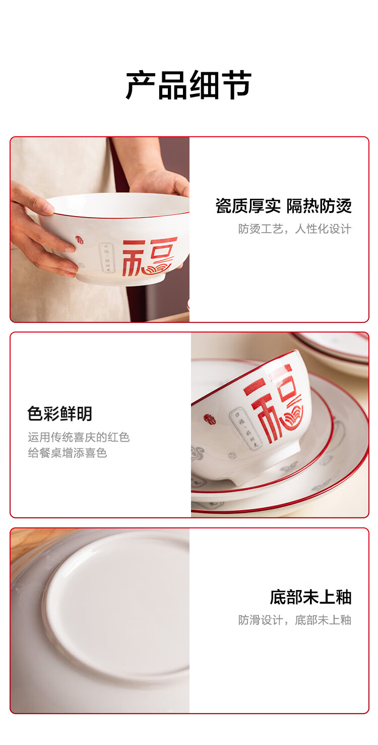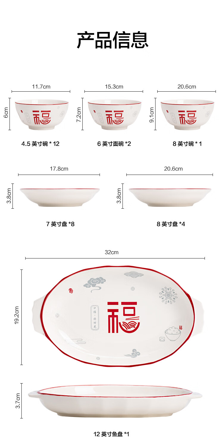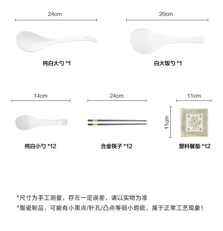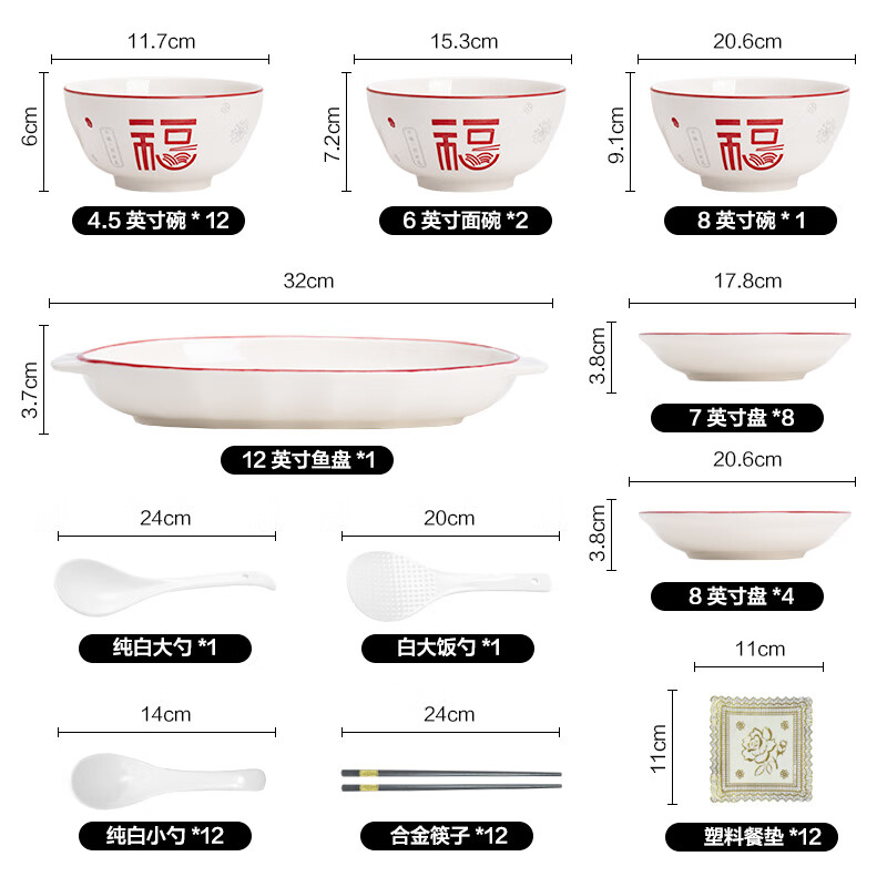 包装清单: 4.5英寸碗* 12 鱼盘*1 合金筷子*12 纯白大勺*1 7英寸盘*6 6英寸面碗*2 塑料餐垫12 纯白大饭勺*1 8英寸碗*1 纯白小勺*12 8英寸盘*6