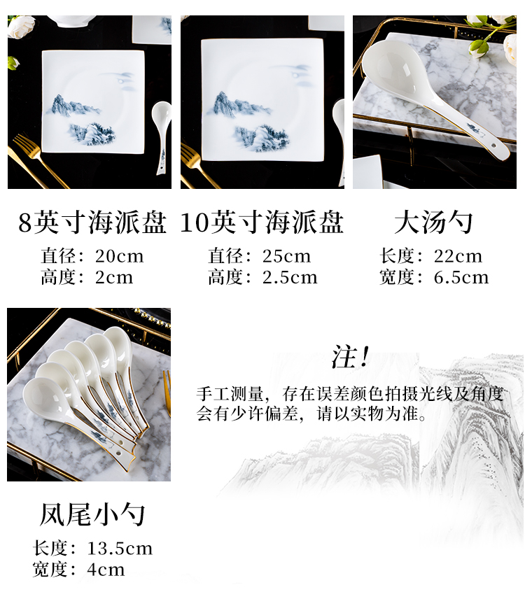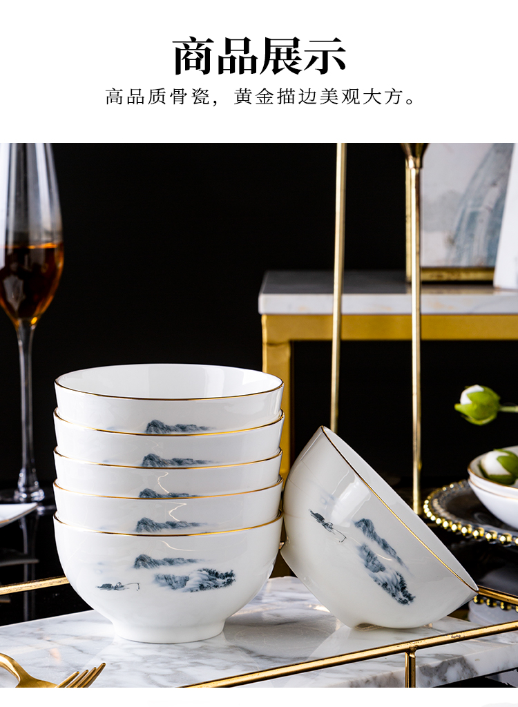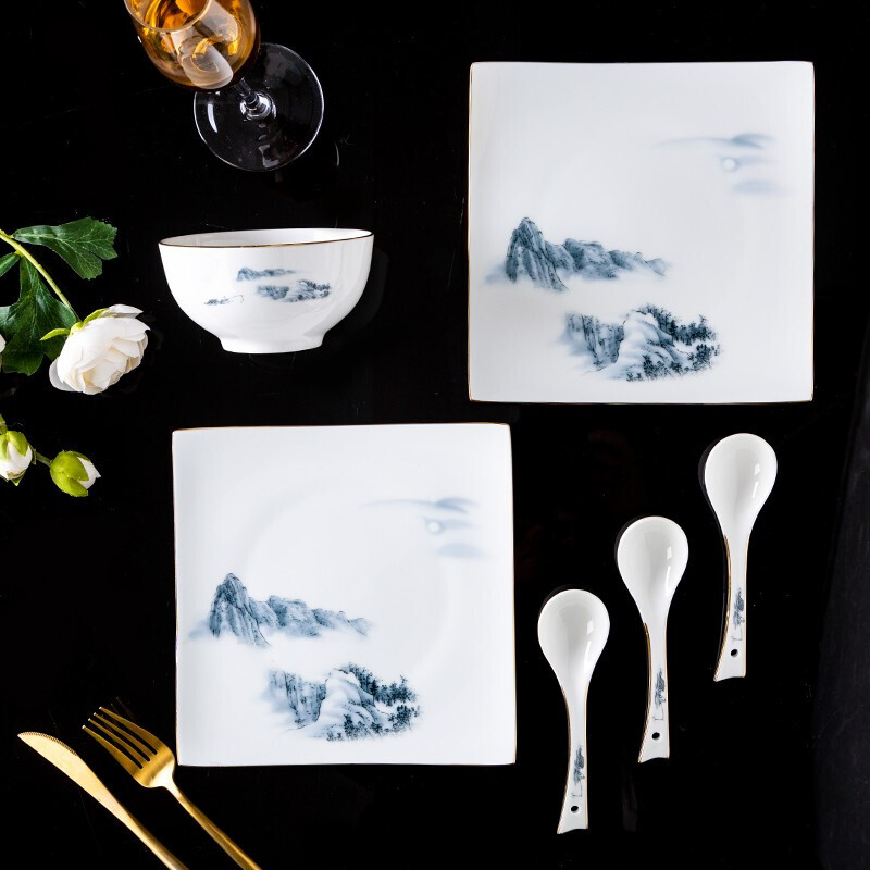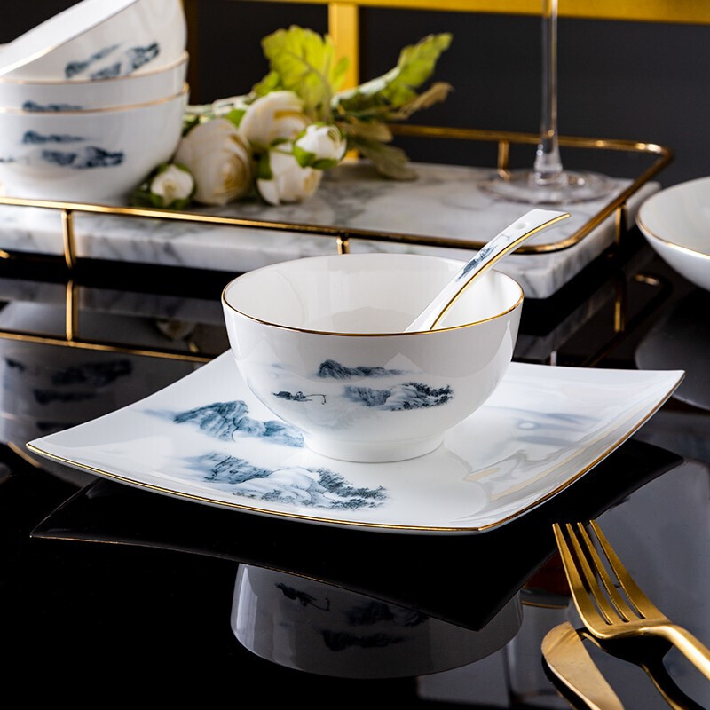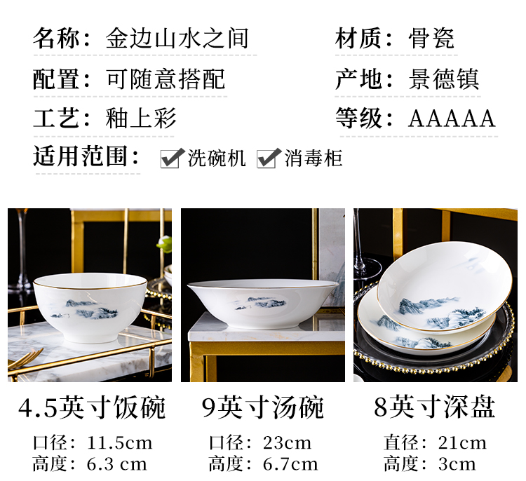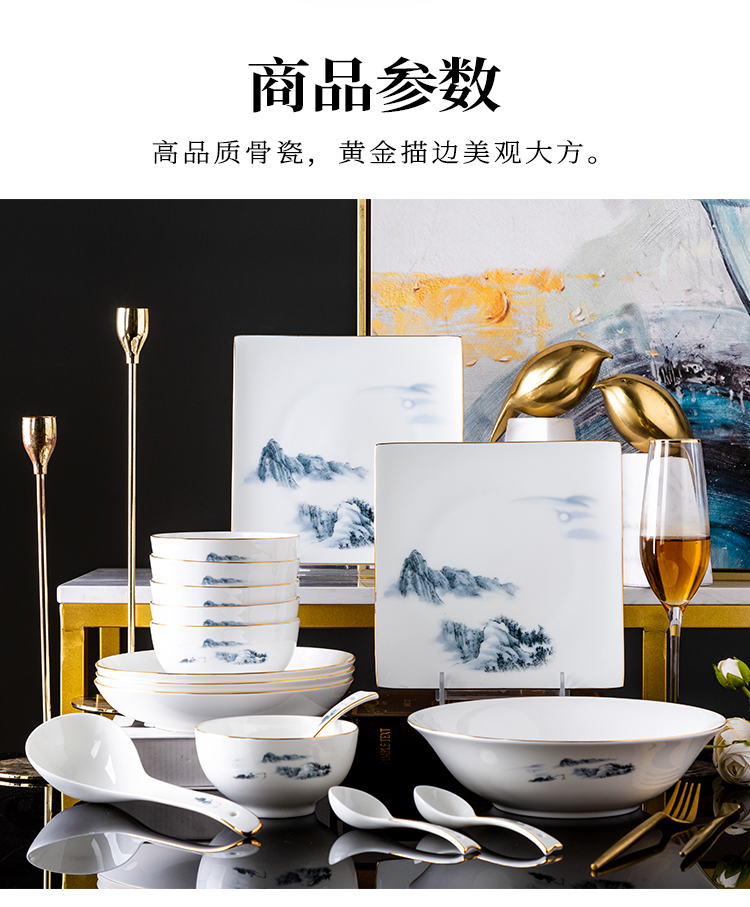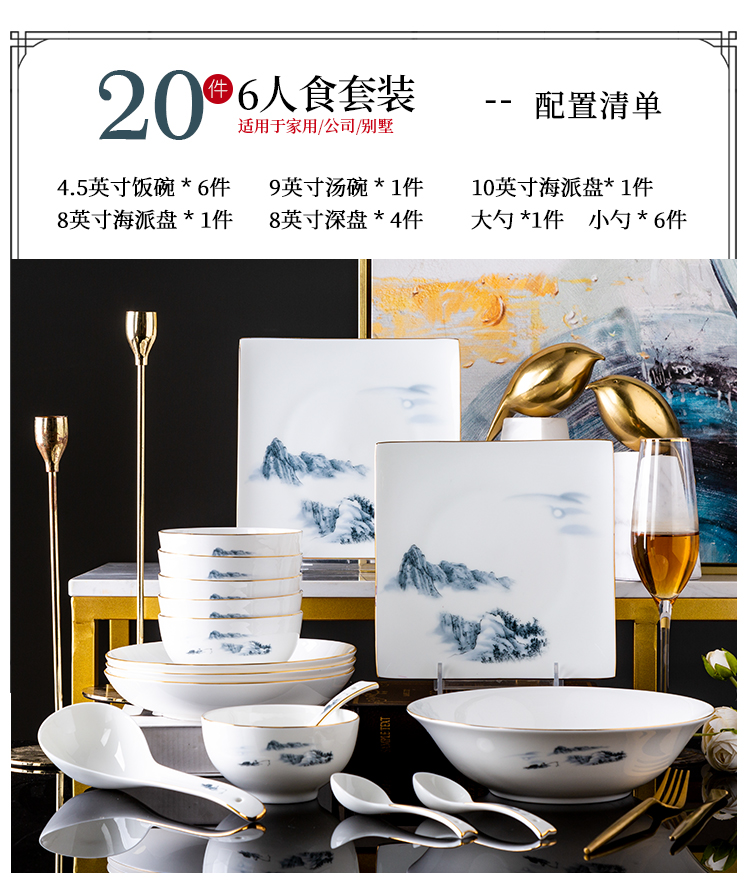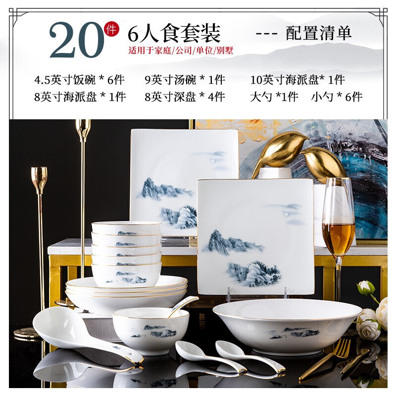 商品名称: 陶相惠景德镇骨瓷家用餐具套装碗碟套装20头组合碗盘勺单位福利送礼 金边山水之间餐具20头/套