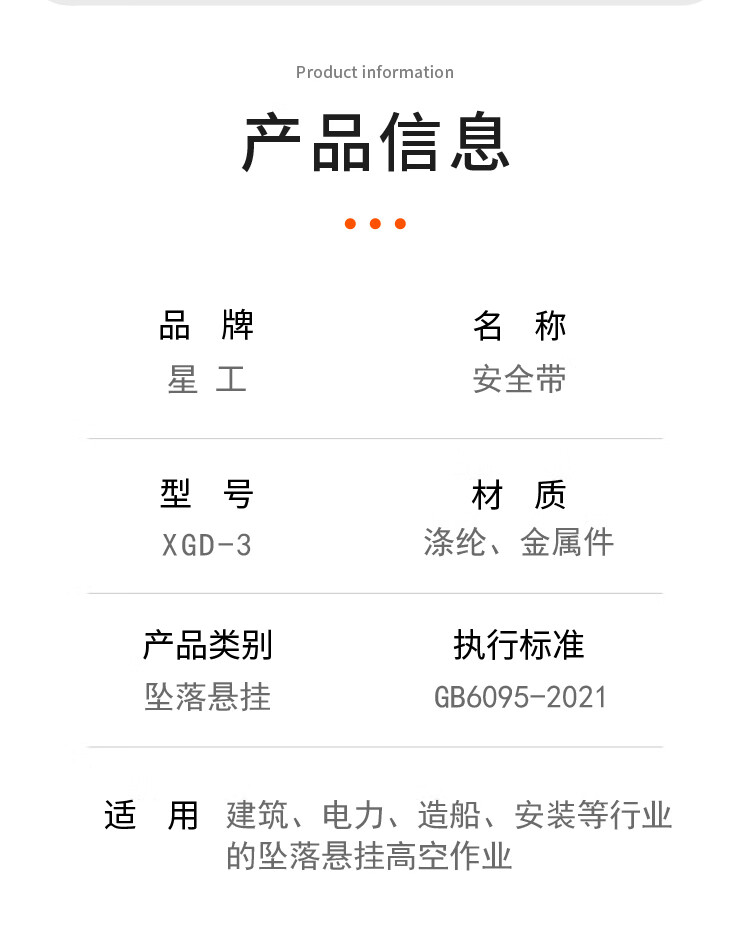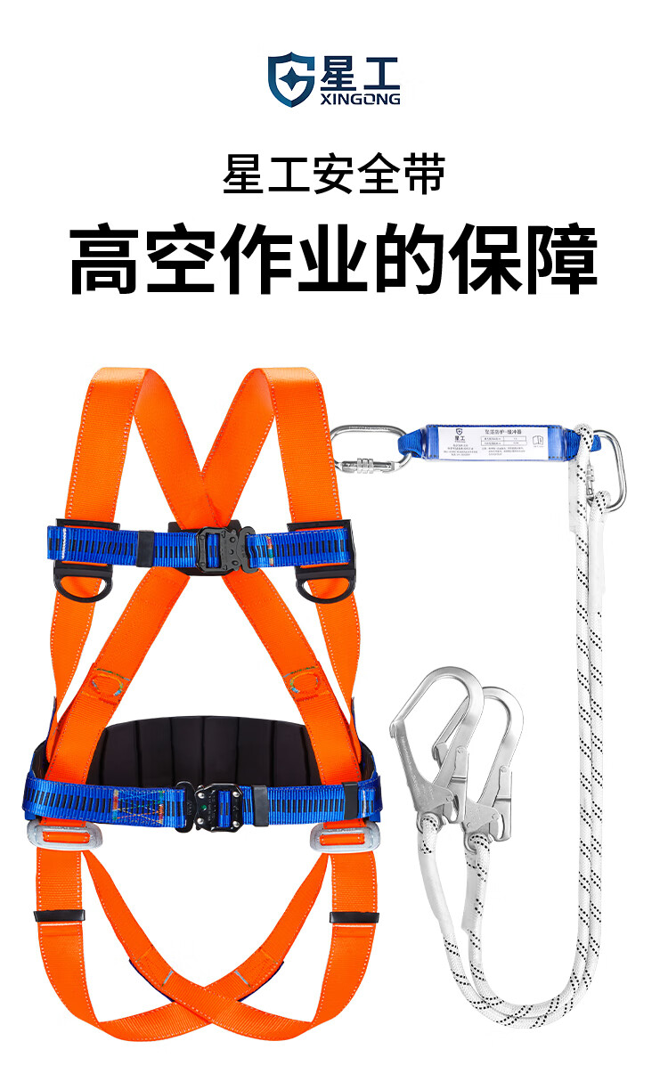 • 商品名称:星工 安全带五点式 双大钩缓冲包 高空作业安全绳国标全身式 防坠落保险带XGD-3 XGD-3/条