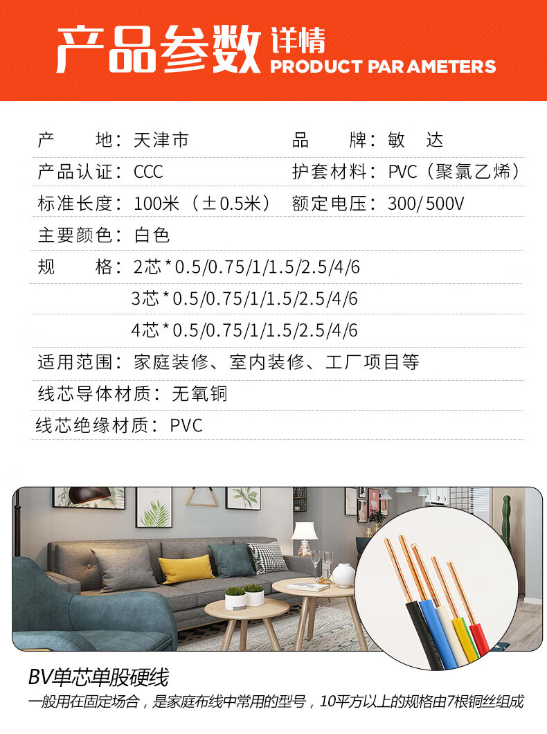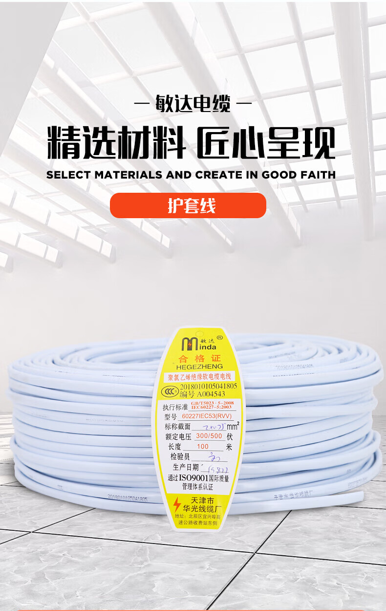 • 商品名称:敏达 软芯电线RVVB2*2.5平方 国标铜芯护套线 2芯电源线 白色100米/卷 RVVB2*2.5/卷