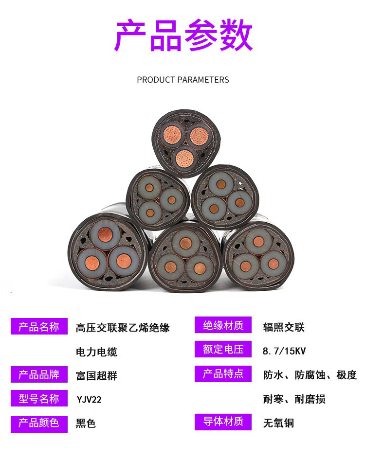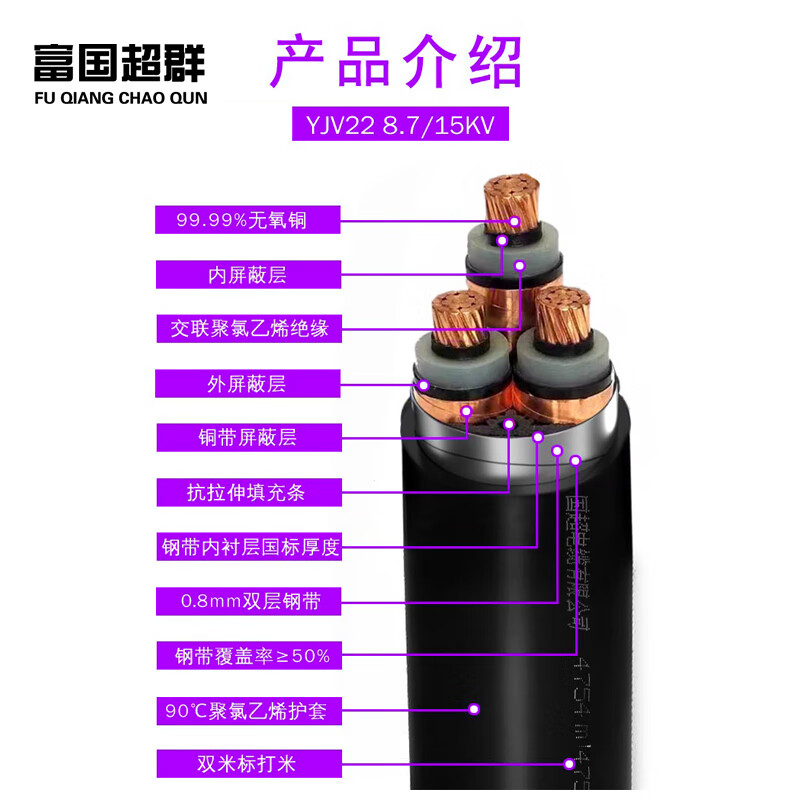 • 商品名称:富国超群电缆电缆线ZC-YJV22-8.7/15KV-3*120平方铜芯铠装3芯阻燃高压交联电力电缆 YJV22-8.7/15KV-3*120-黑色 1m/米