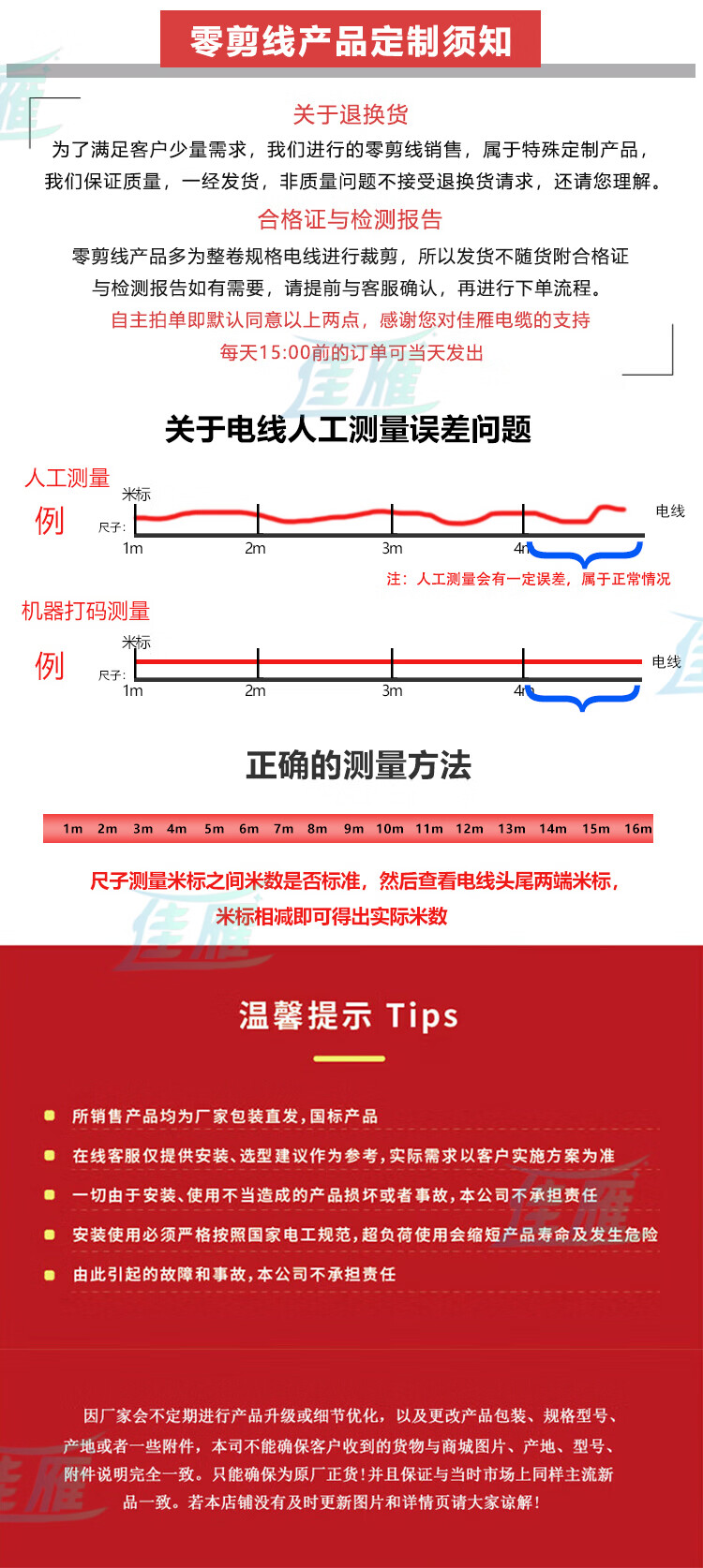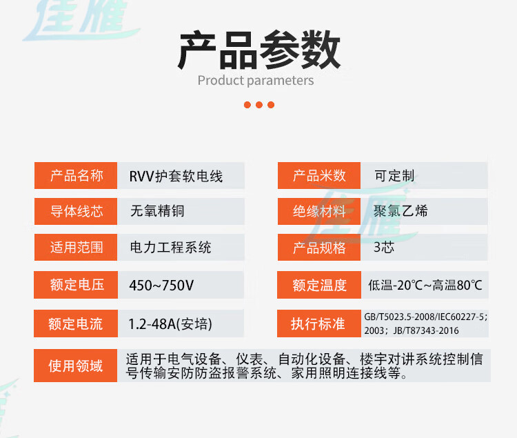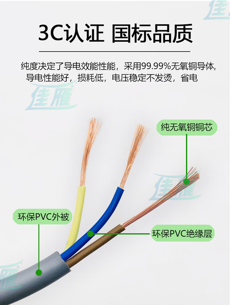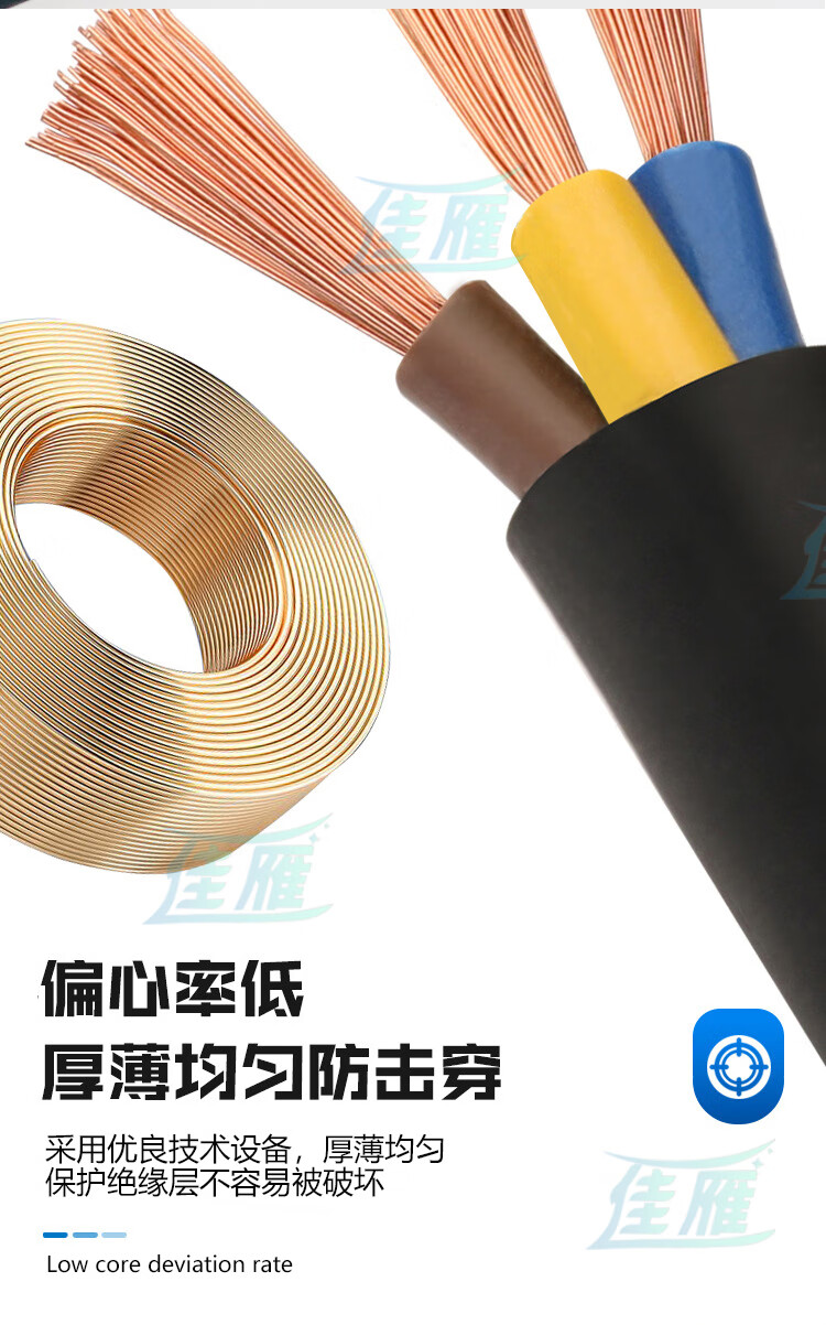 • 商品名称:佳雁电线电缆RVV 3*4平方国标阻燃三芯电源线户外多股铜丝软护套线1米 3*4 RVV/米