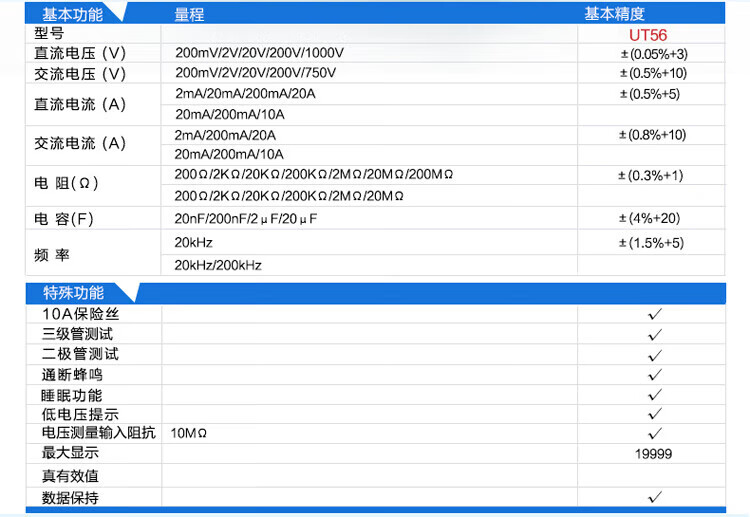 • 商品名称:优利德(UNI-T)UT56 数字万用表 万能表 四位半高精度 手持式多功能 小型电工多用表 UT56/台