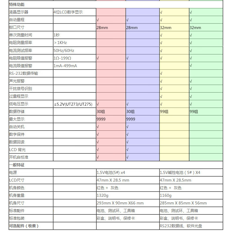 包装清单: 仪表、测试环、电池、仪表箱、说明书
