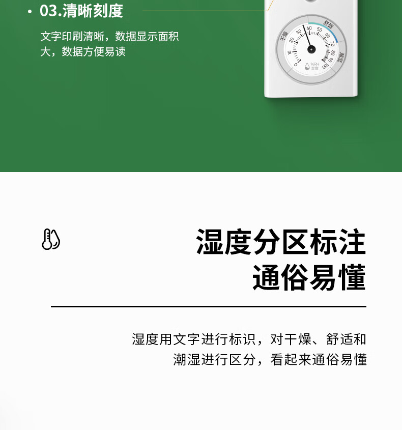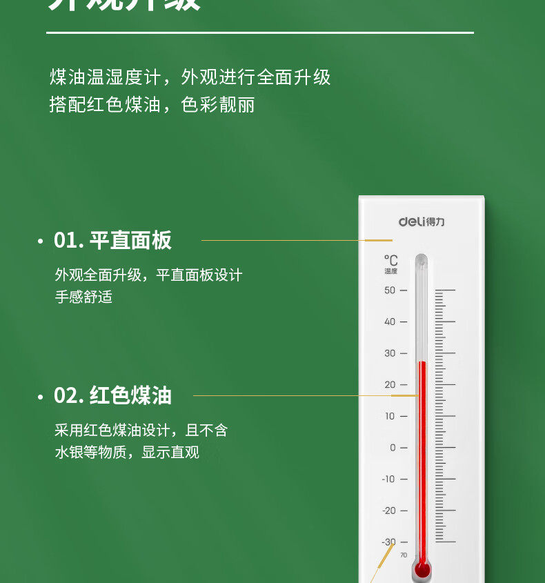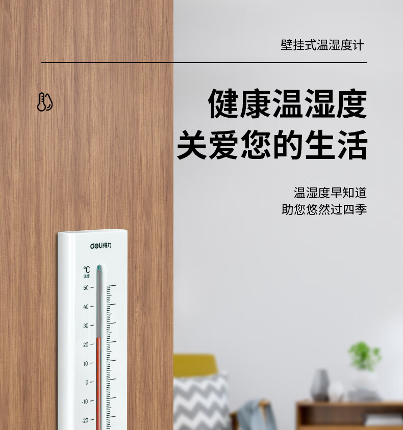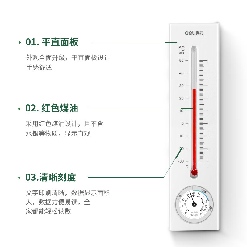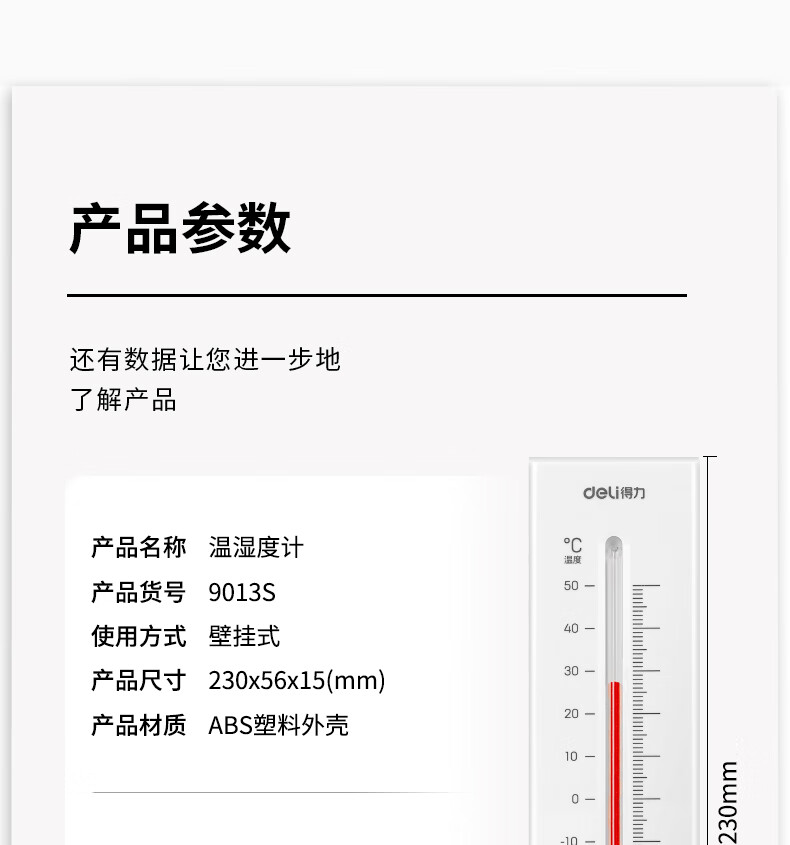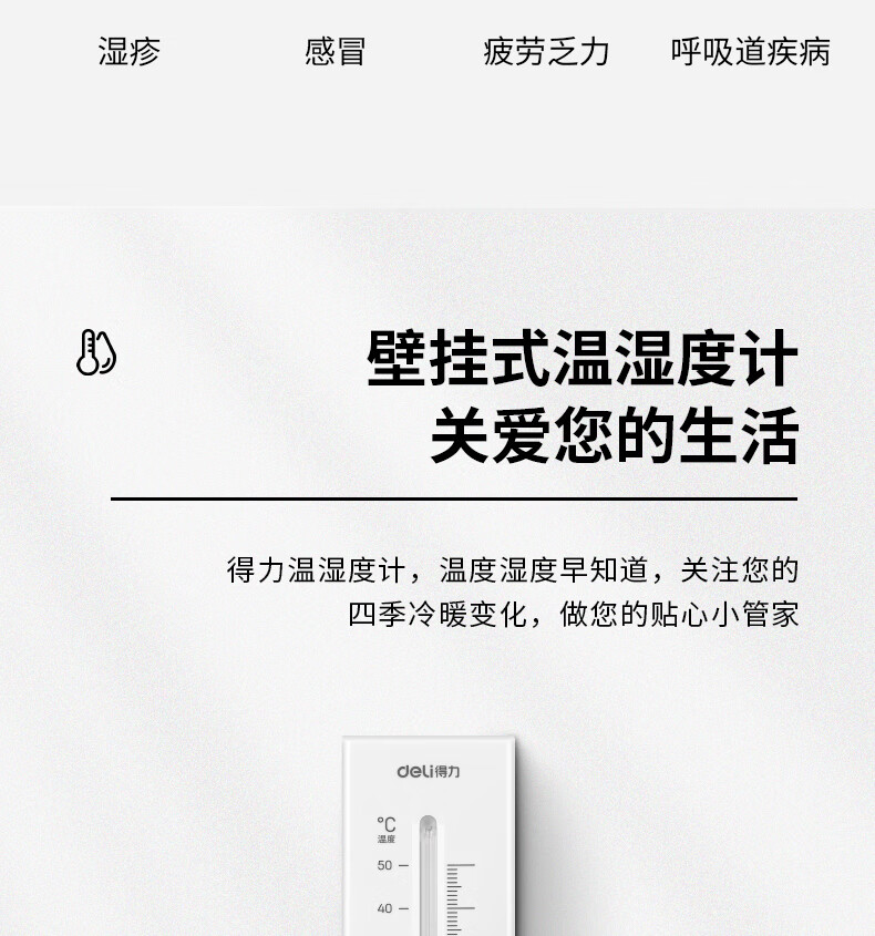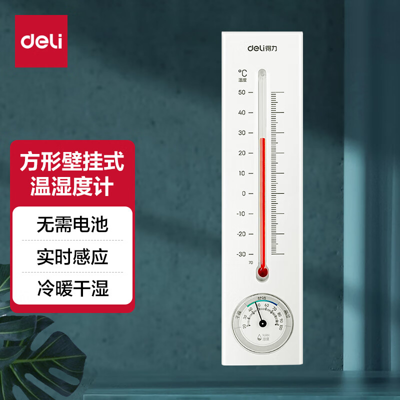• 商品名称:得力(deli)壁挂式温湿度计 免电池简约家用温度表 室内高精度 白色 9013S 9013S/卡