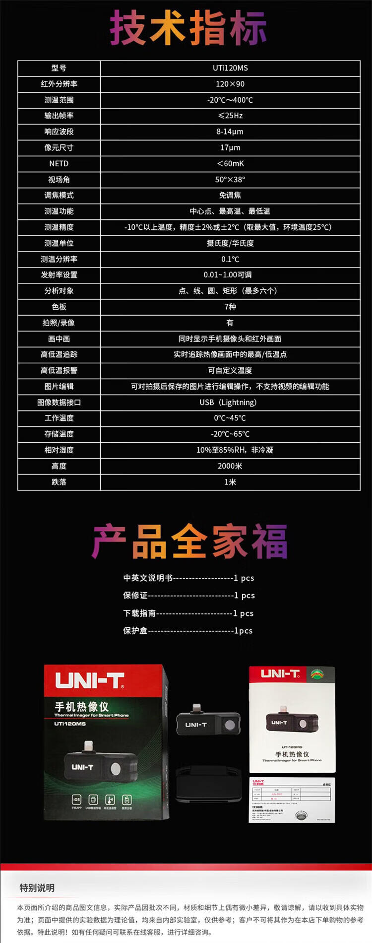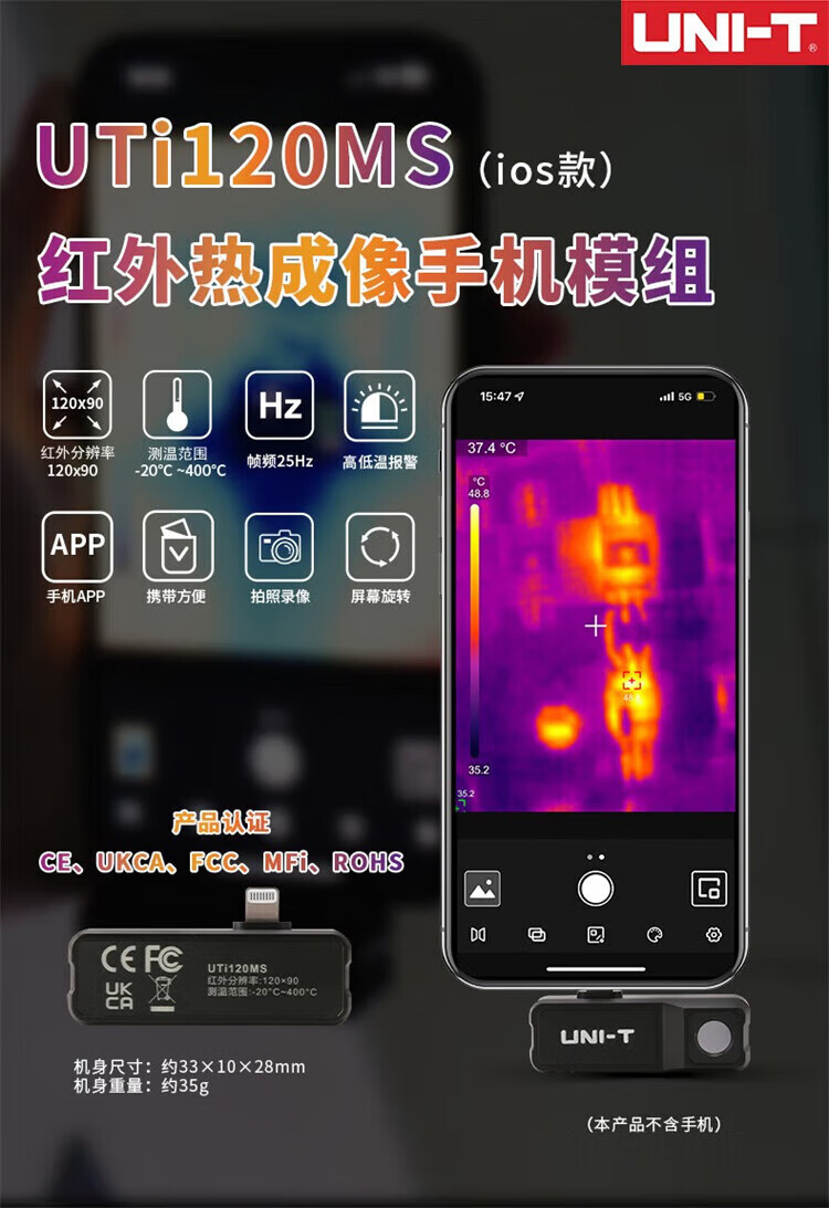 • 商品名称:优利德(UNI-T)UTi120MS 红外热成像仪手机模组 热像仪 电力故障 地暖测漏 户外夜视仪 120×90像素 UTi120MS/台