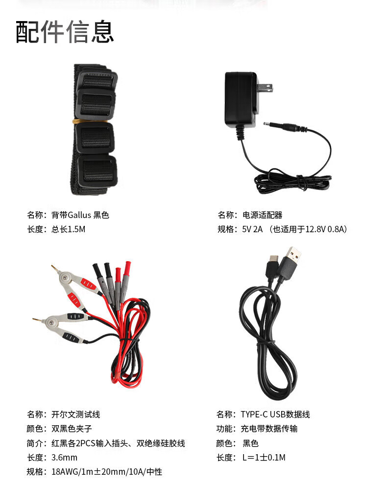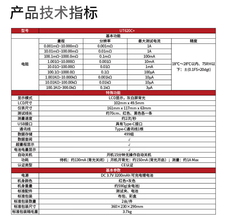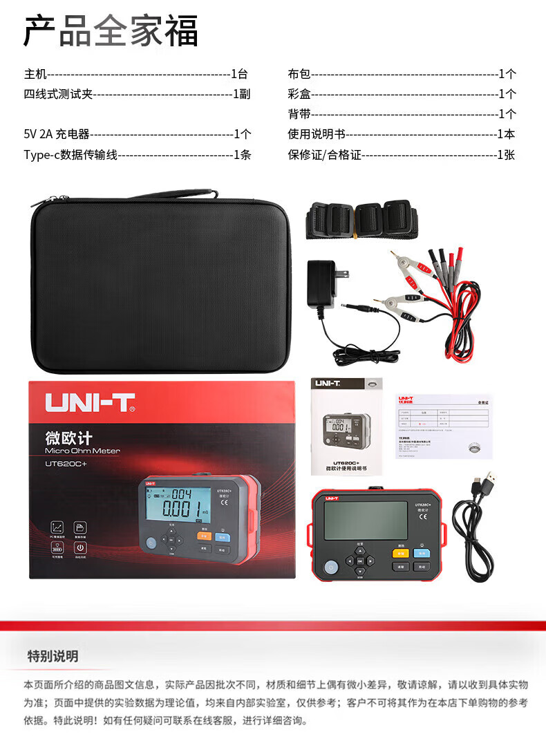 包装清单: 主机、开尔文测试线、电池、电源适配器、彩盒