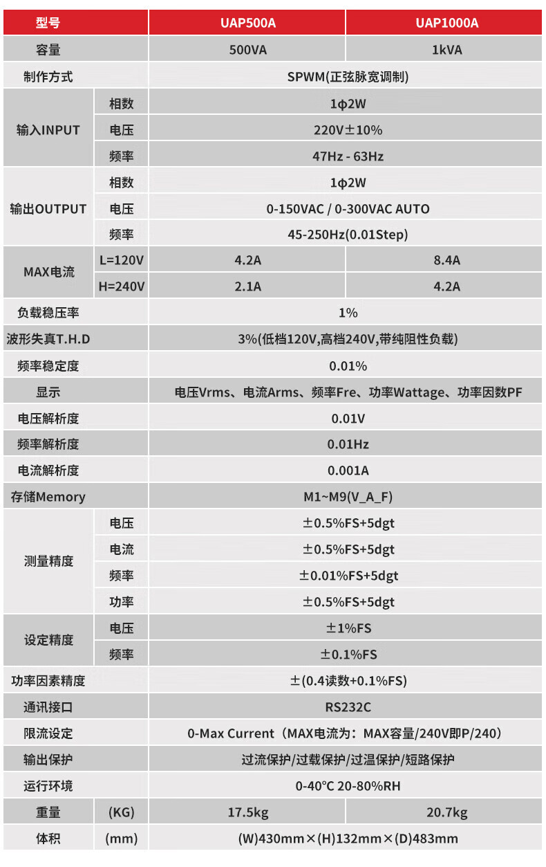 • 商品名称:优利德(UNI-T)UAP1000A 可编程交流变频电源 双通道 1kVA 大功率稳压电源 UAP1000A/台