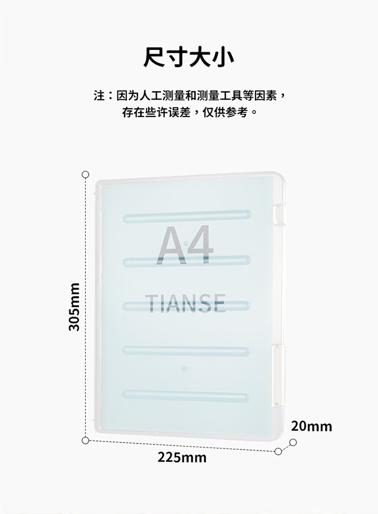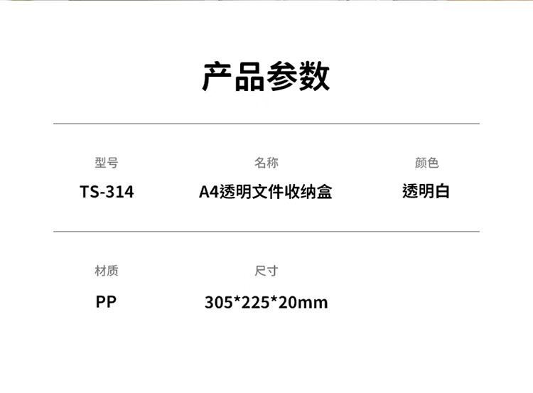 • 商品名称:天色 A4透明文件盒 20mm档案盒文件资料盒 透明证件照片收纳盒防水整理盒办公用品 TS-314 透明文件盒/个