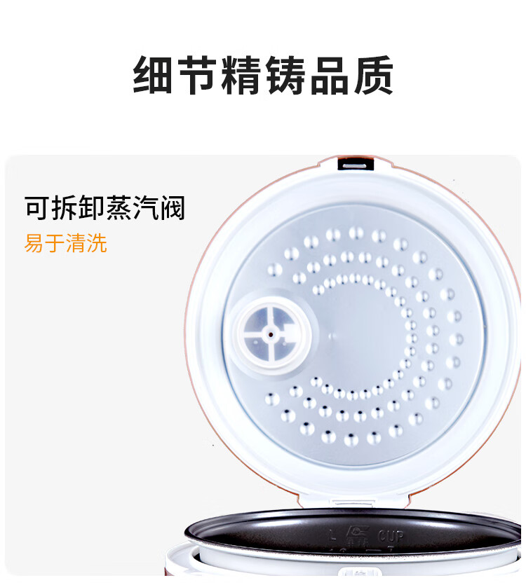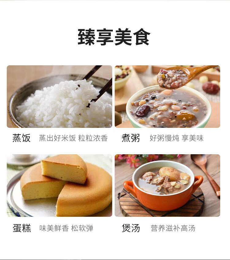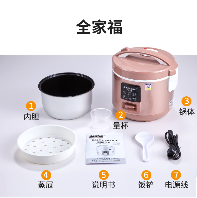 包装清单: 电饭锅 × 1 蒸笼× 1 内胆× 1 锅盖× 1 说明书保修卡 × 1 饭铲 × 1 电源线× 1