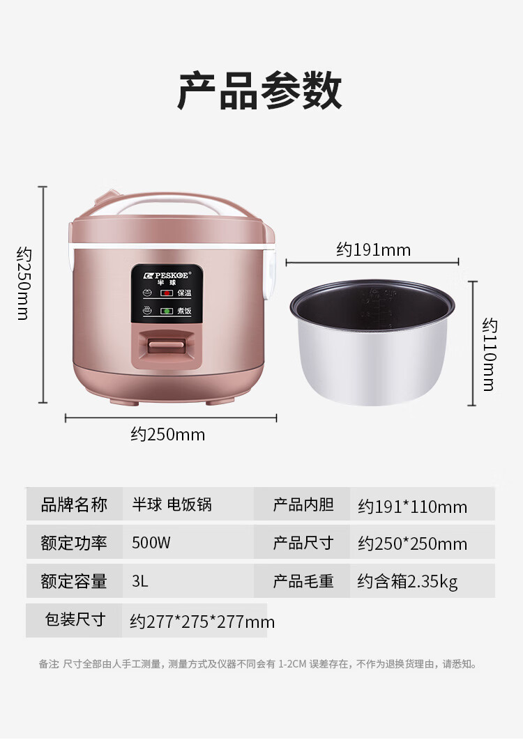 • 商品名称:半球(Peskoe)电饭煲3L电饭锅FJ30-X 适用3至4人使用 FJ30-X/台