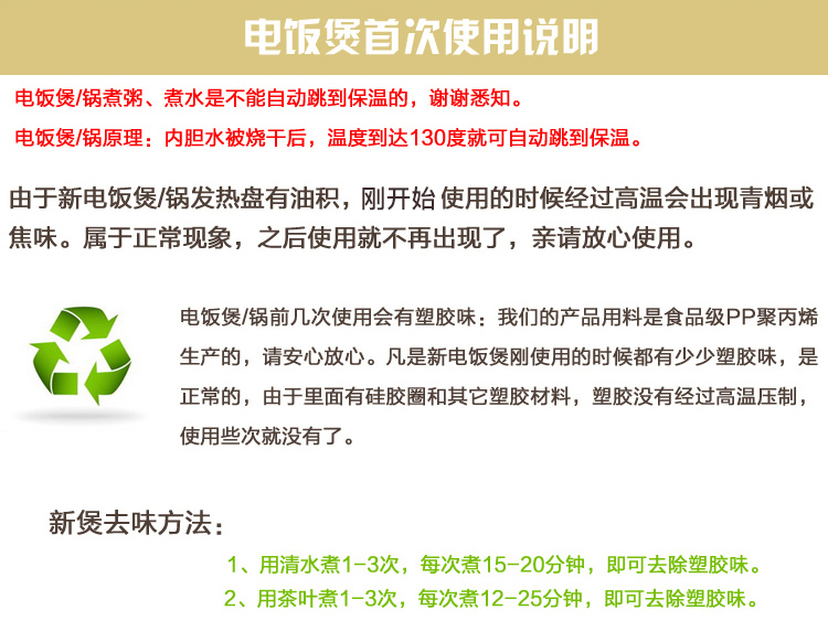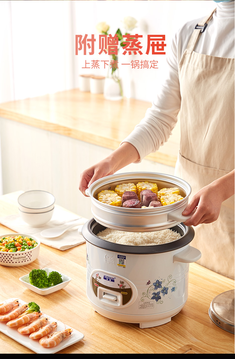 包装清单: 电饭锅 × 1 蒸笼× 1 内胆× 1 锅盖× 1 说明书保修卡 × 1 饭铲 × 1 电源线× 1 量杯× 1