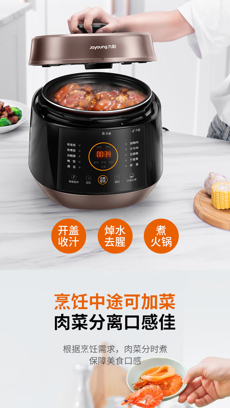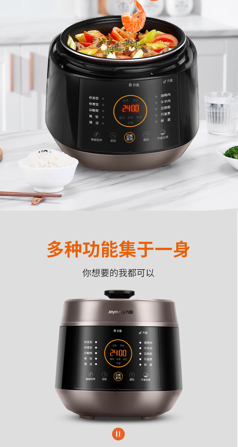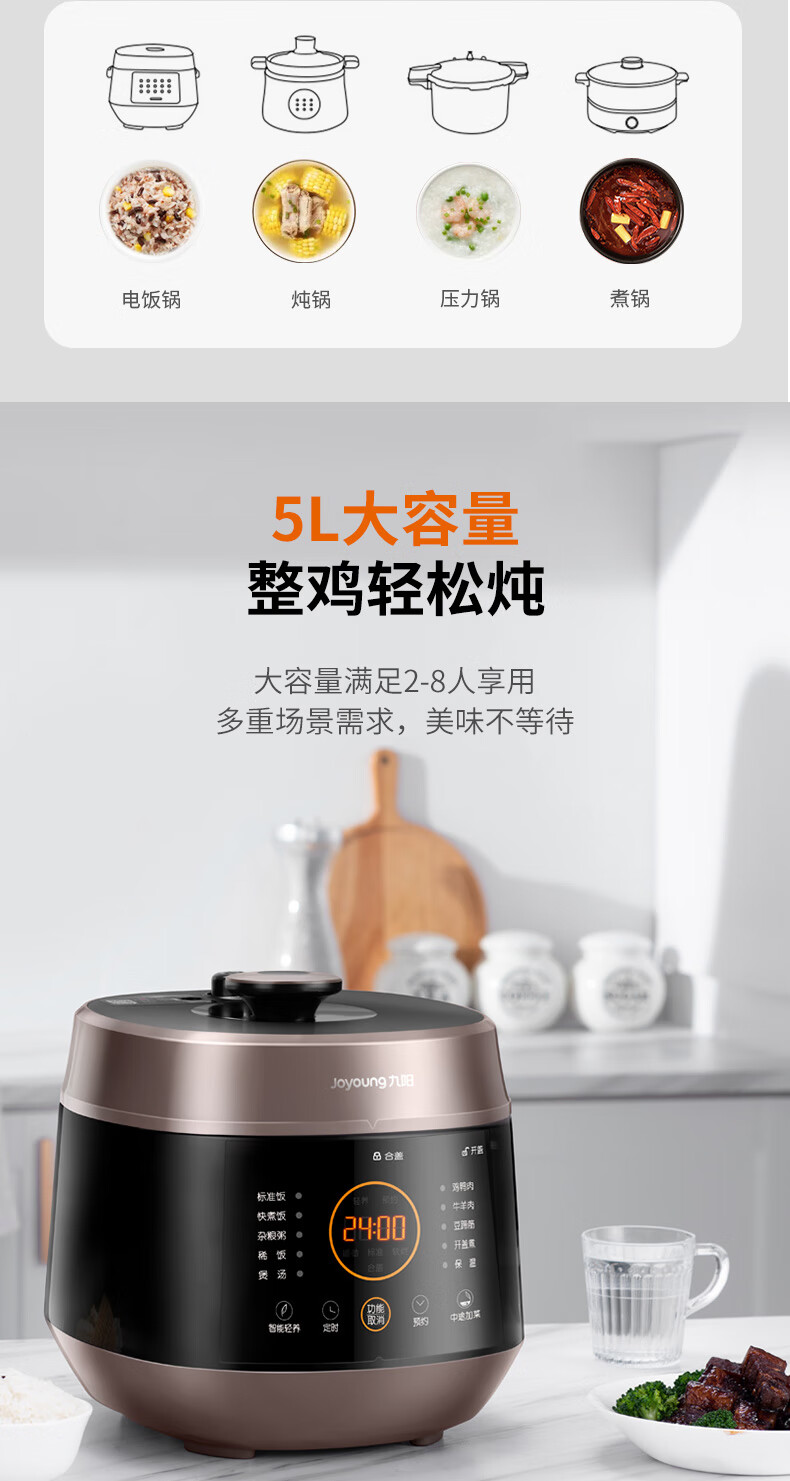 • 商品名称:九阳(Joyoung)5L智能家用4-5人一锅双胆多功能电压力锅压力煲铜匠大火营养煮高压锅预约定时Y-50C82 Y-50C82/台