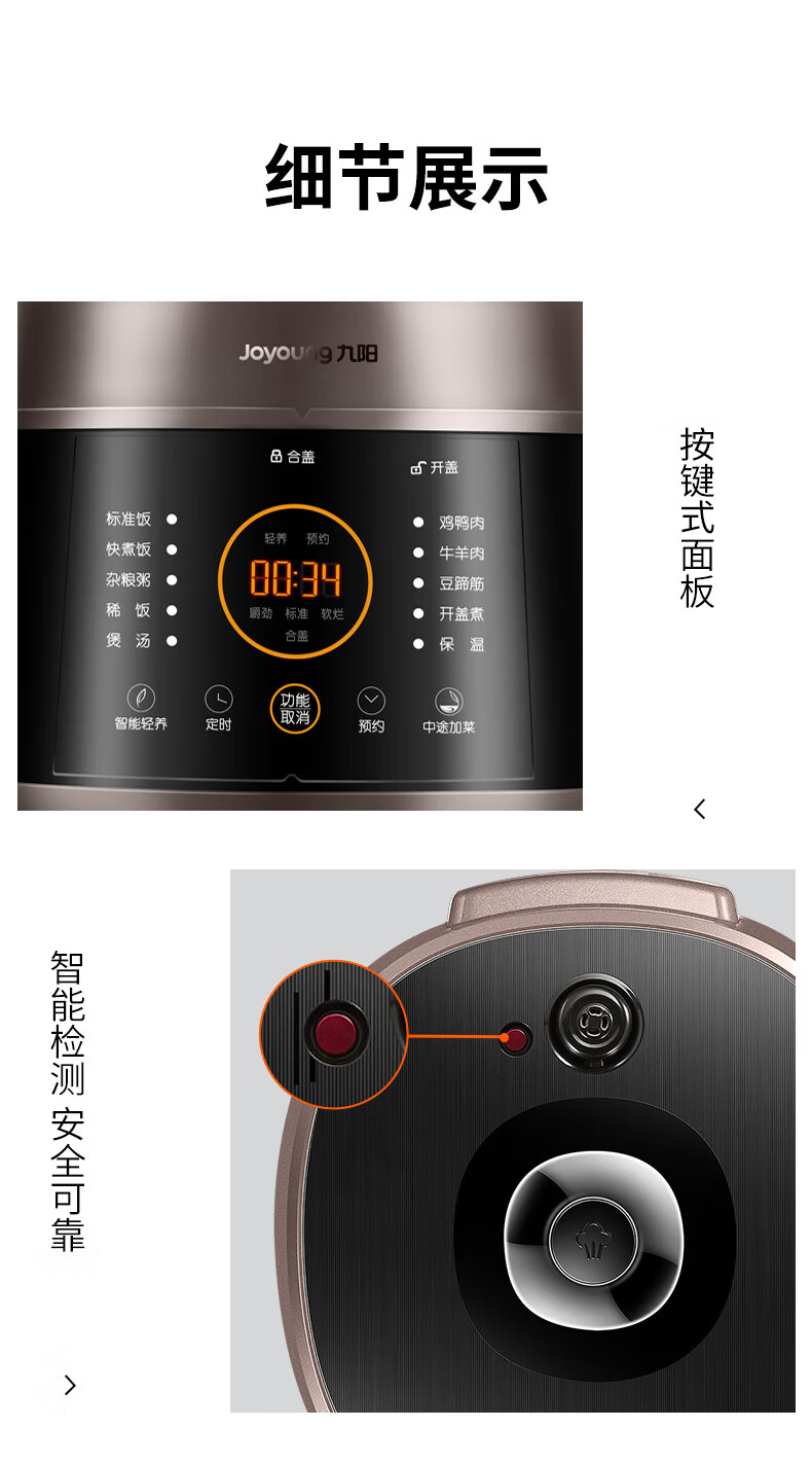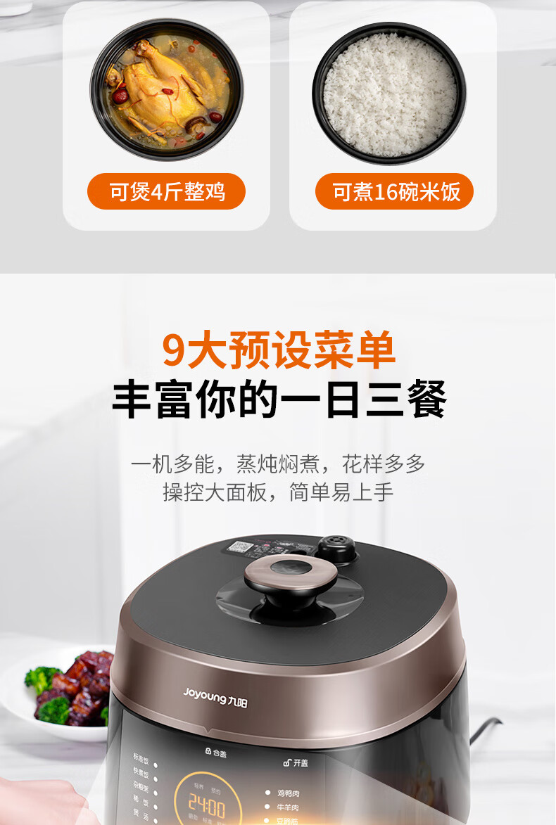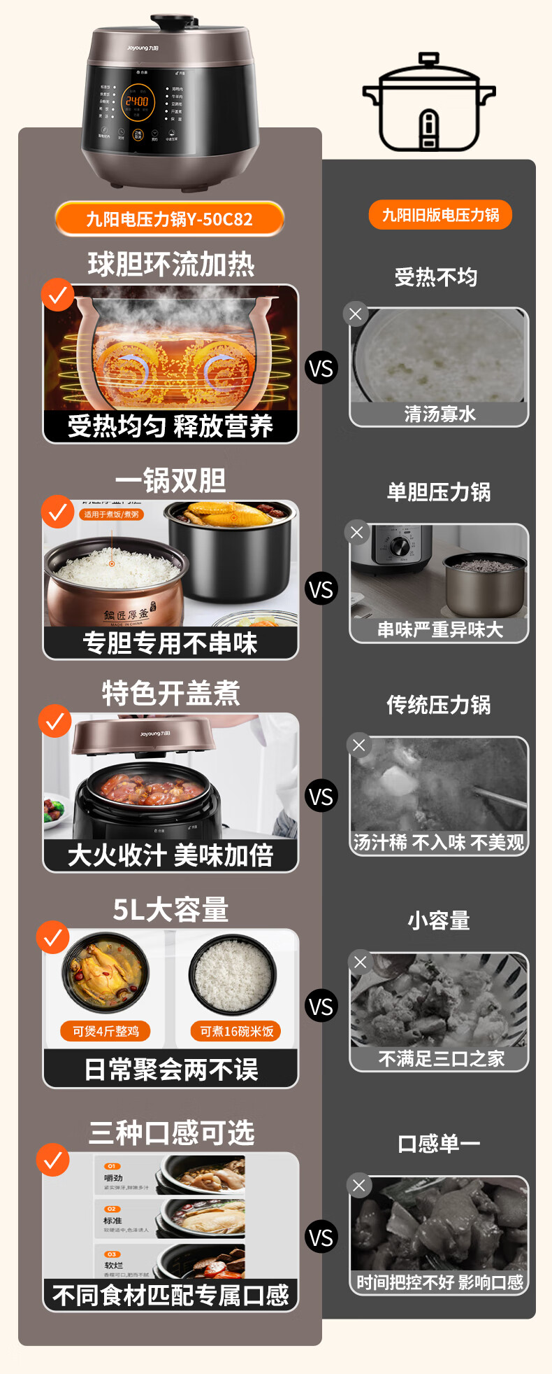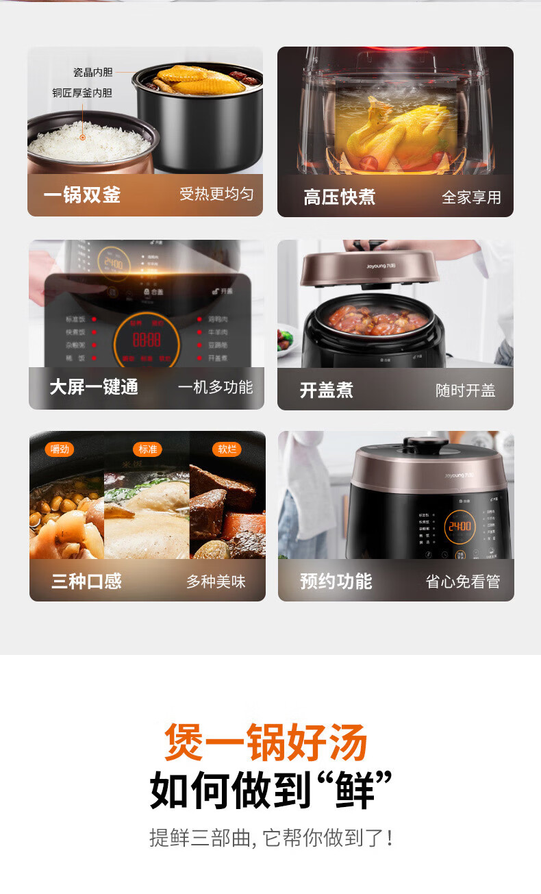 • 商品名称:九阳(Joyoung)5L智能家用4-5人一锅双胆多功能电压力锅压力煲铜匠大火营养煮高压锅预约定时Y-50C82 Y-50C82/台