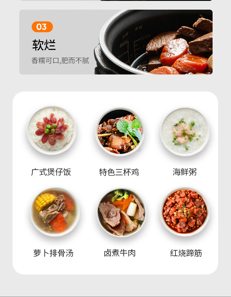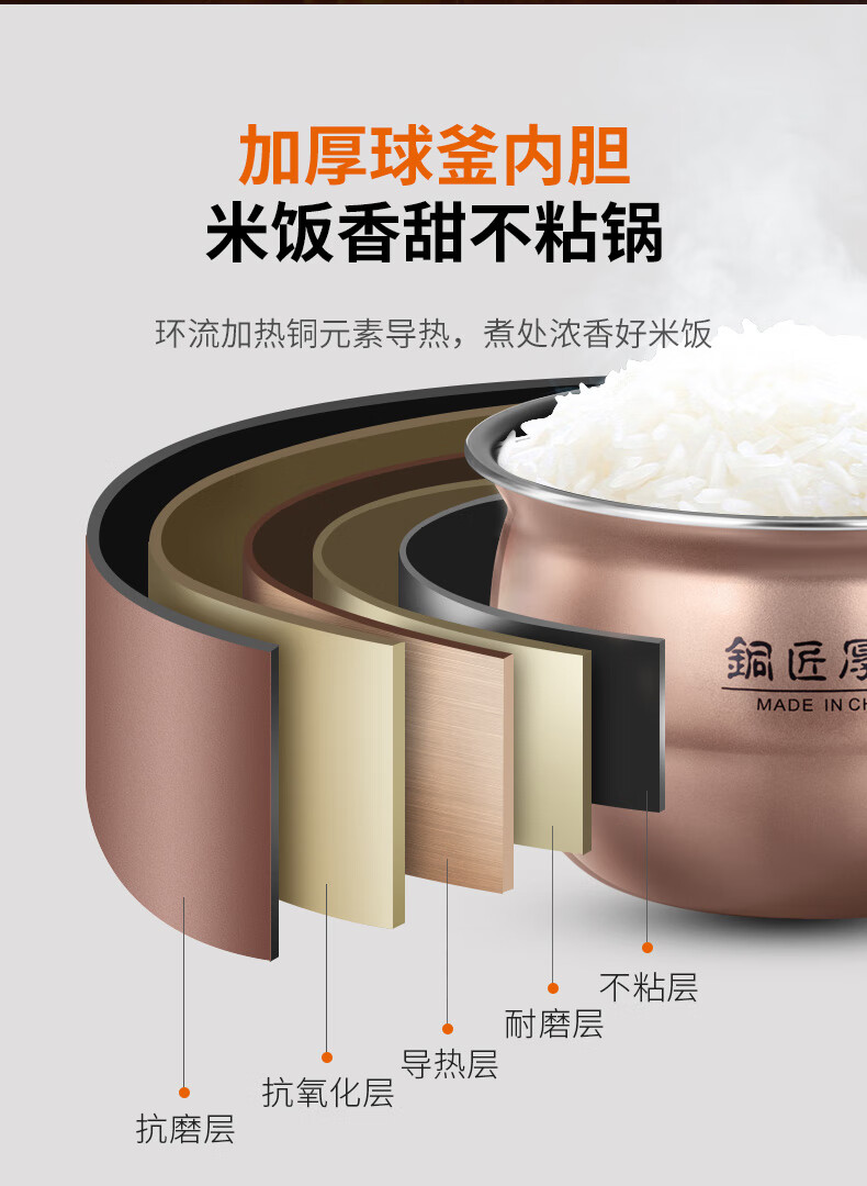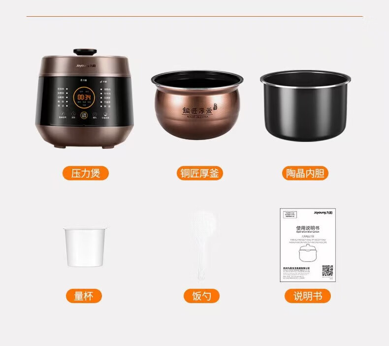 包装清单: 电压力锅×1 铜匠厚釜内胆×1 瓷晶内胆× 1 量杯×1 饭勺×1 电源线×1 说明书×1