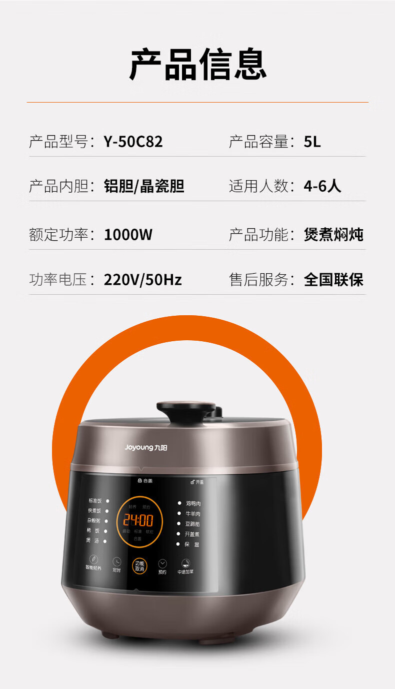 商品名称: 九阳(Joyoung)5L智能家用4-5人一锅双胆多功能电压力锅压力煲铜匠大火营养煮高压锅预约定时Y-50C82 Y-50C82/台