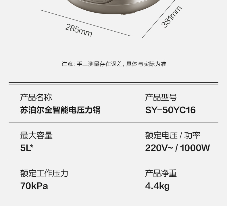 • 商品名称:苏泊尔电压力锅5L全自动智能预约家用煲汤多功能面板易清洁双内胆压力锅电饭煲高压锅3-6人SY-50YC16 SY-50YC16/个
