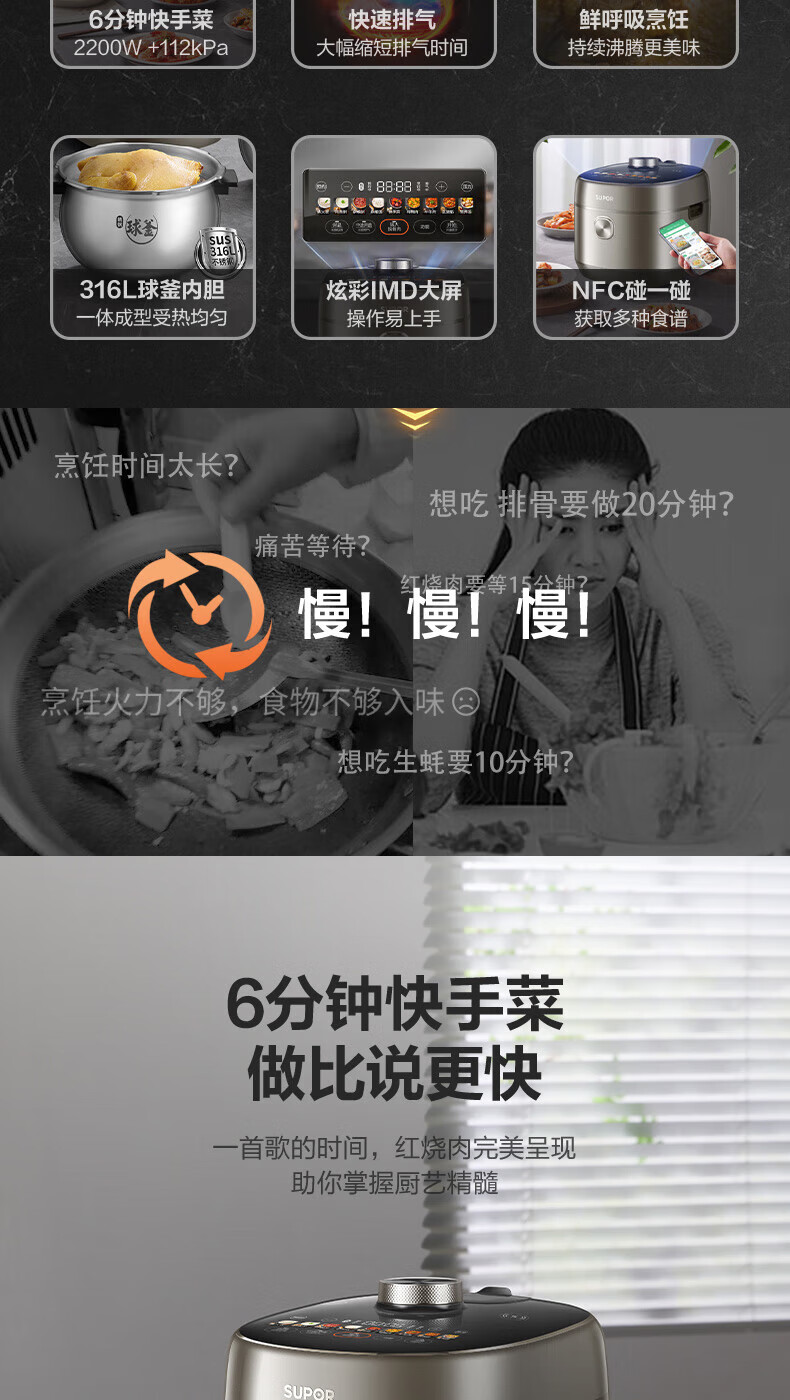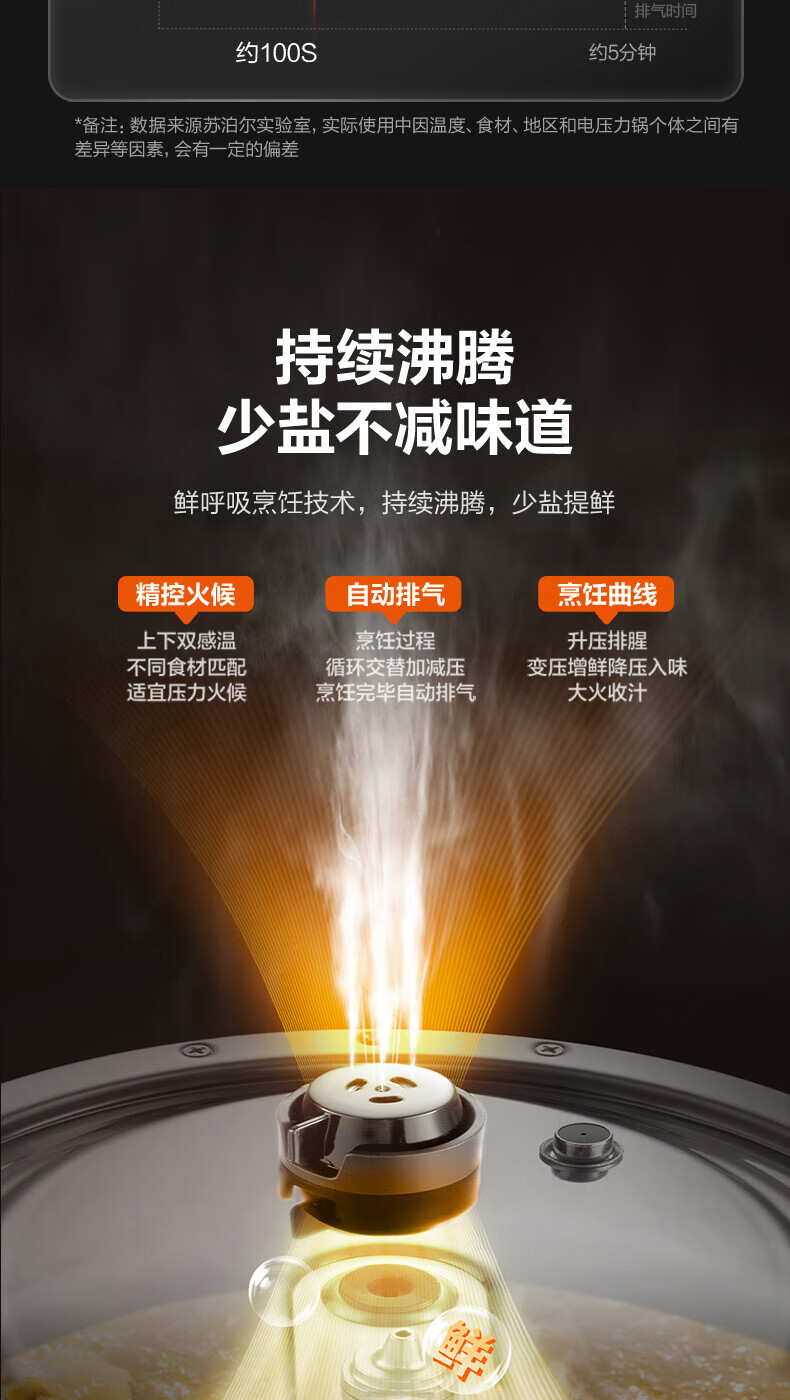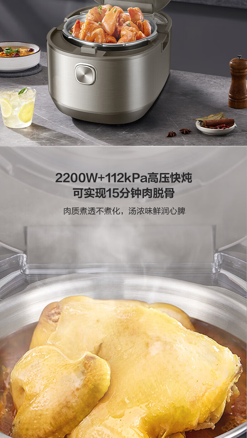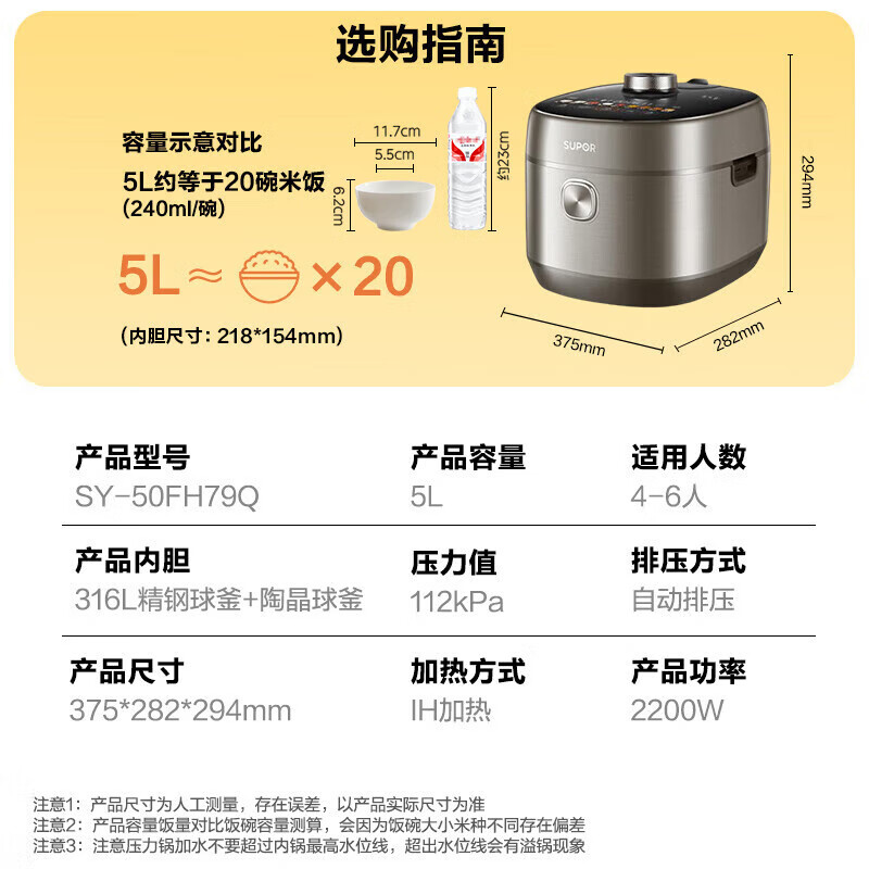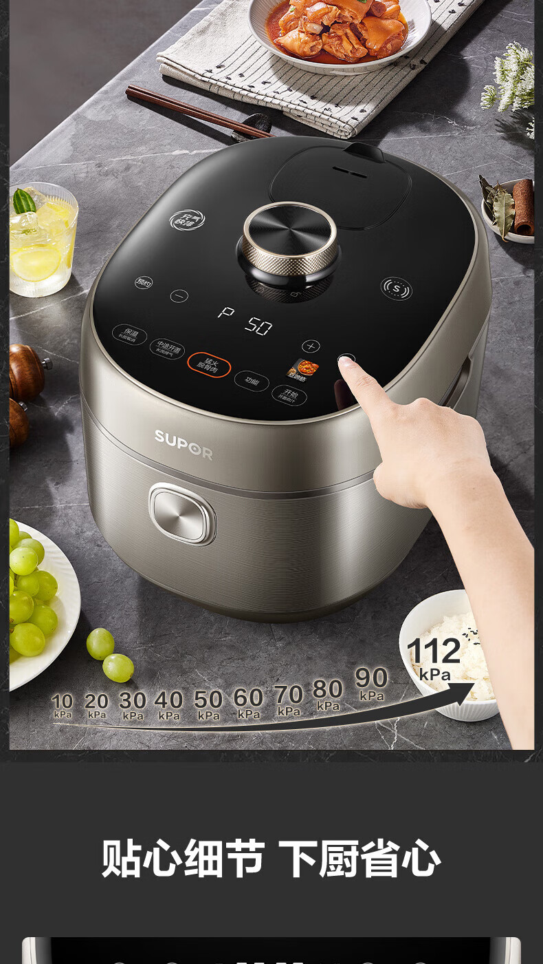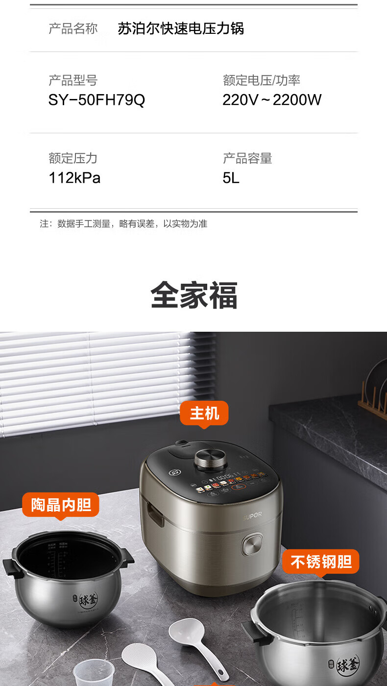 • 商品名称:苏泊尔(SUPOR)快排100系列电压力锅5L 112kpa 鲜呼吸IH加热 2200W精钢球釜4-6人家用 SY-50FH79Q SY-50FH79Q/个