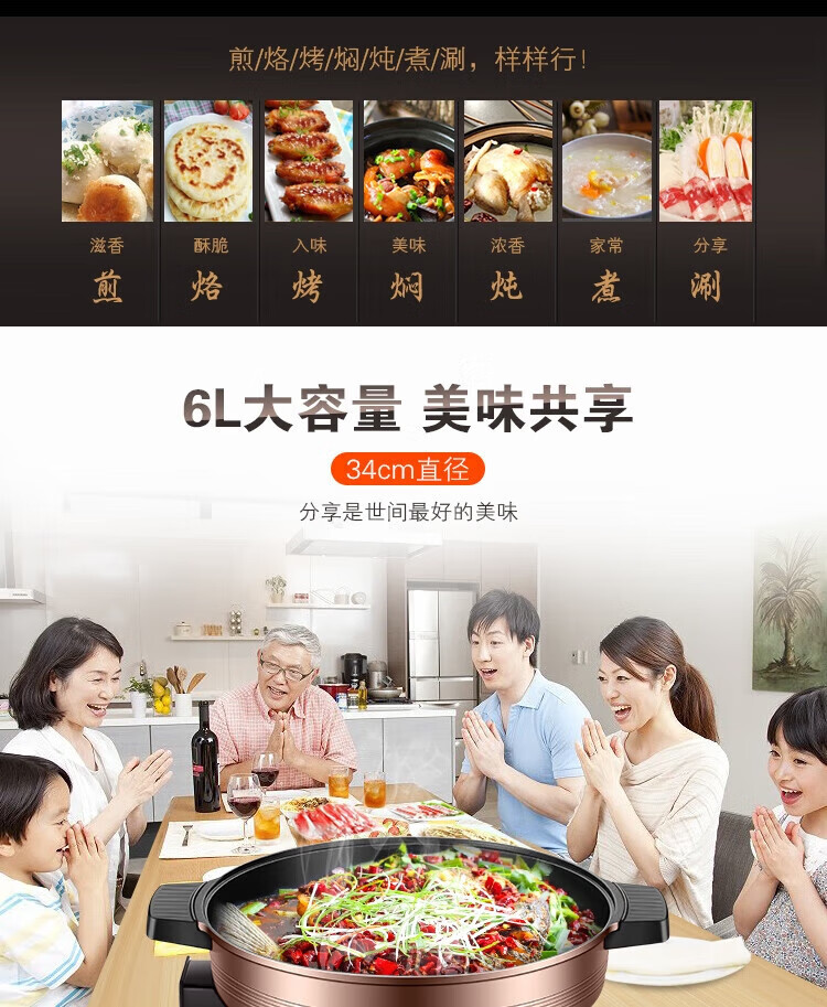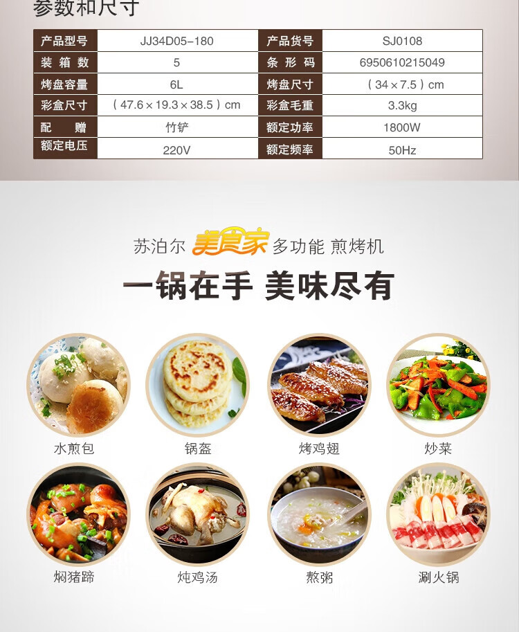 商品名称: 苏泊尔电饼铛煎烤机6L大容量家用多用途电火锅 火力可调JJ34D05-180 JJ34D05-180/个