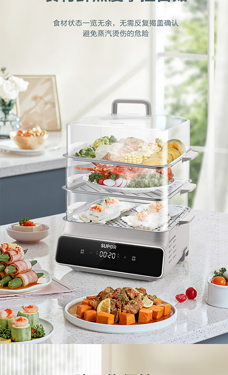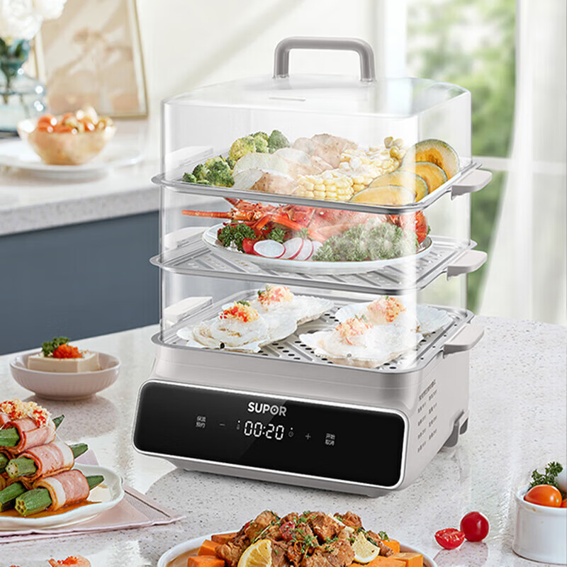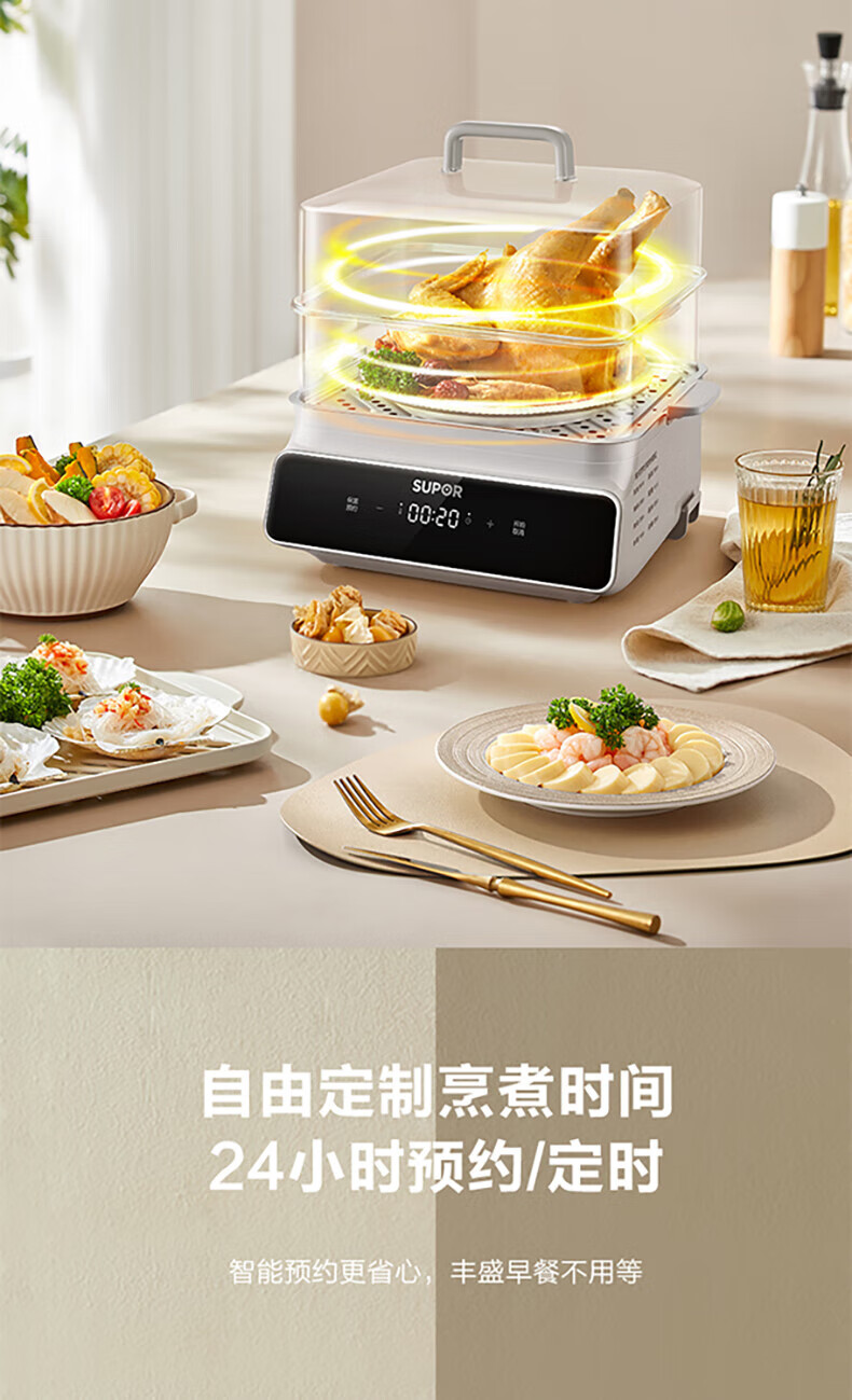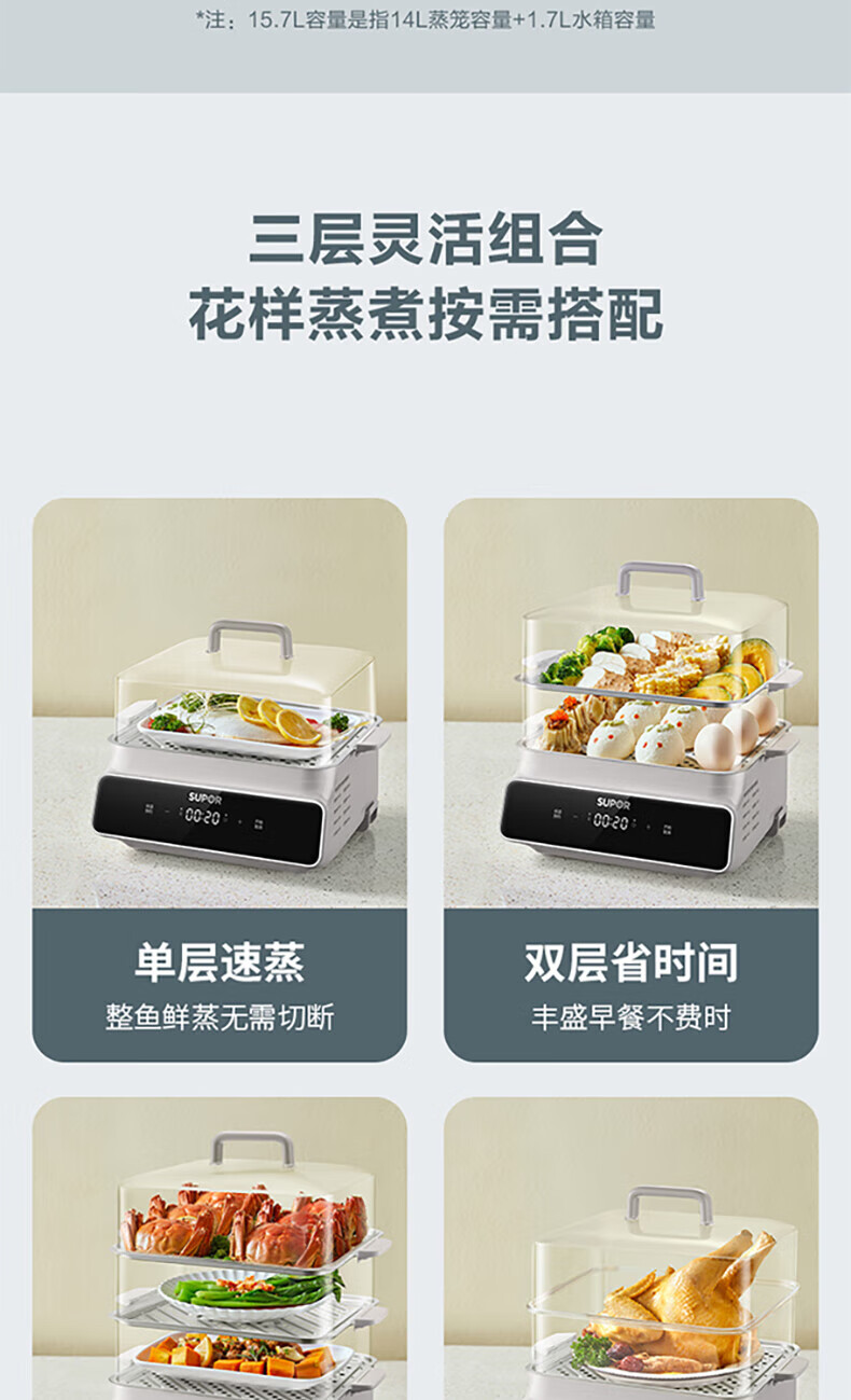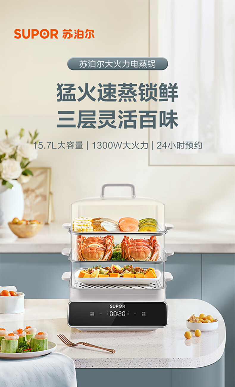 • 商品名称:苏泊尔电蒸锅15.7L大容量家用多功能电蒸笼三层分体式可拆洗智能预约定时蒸锅带蒸盘蒸包子锅ZN26FC32 ZN26FC32/个