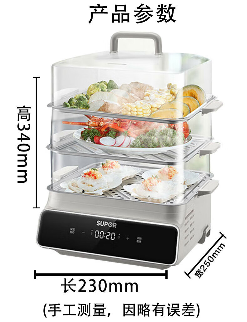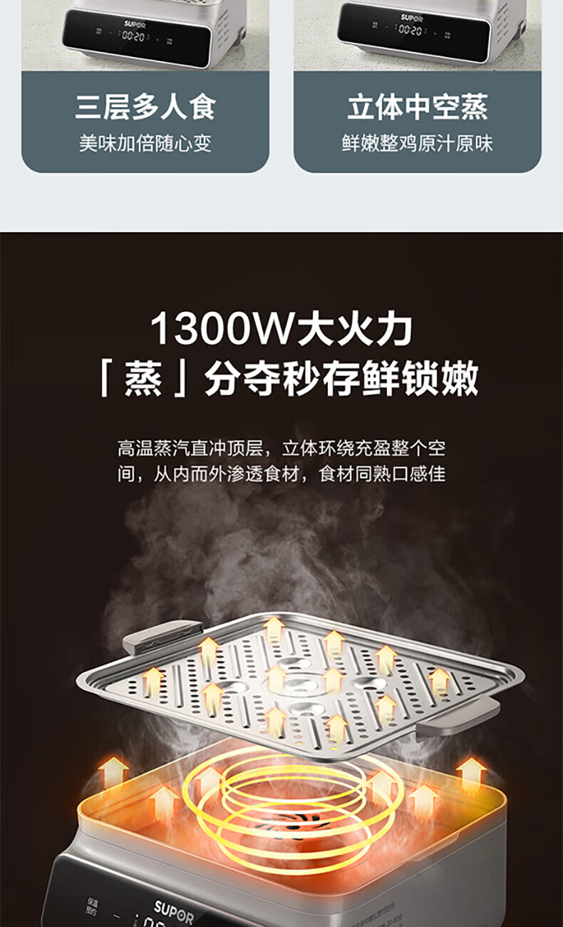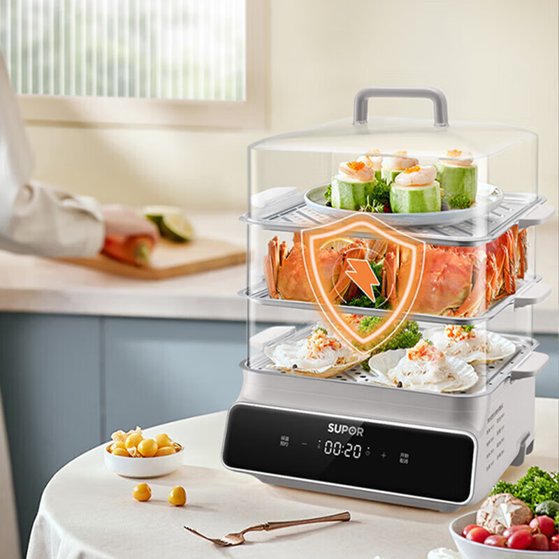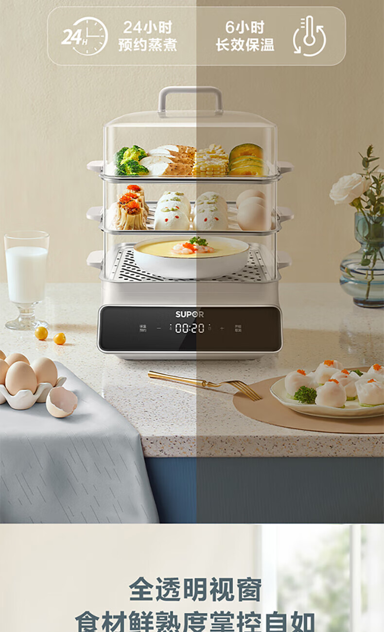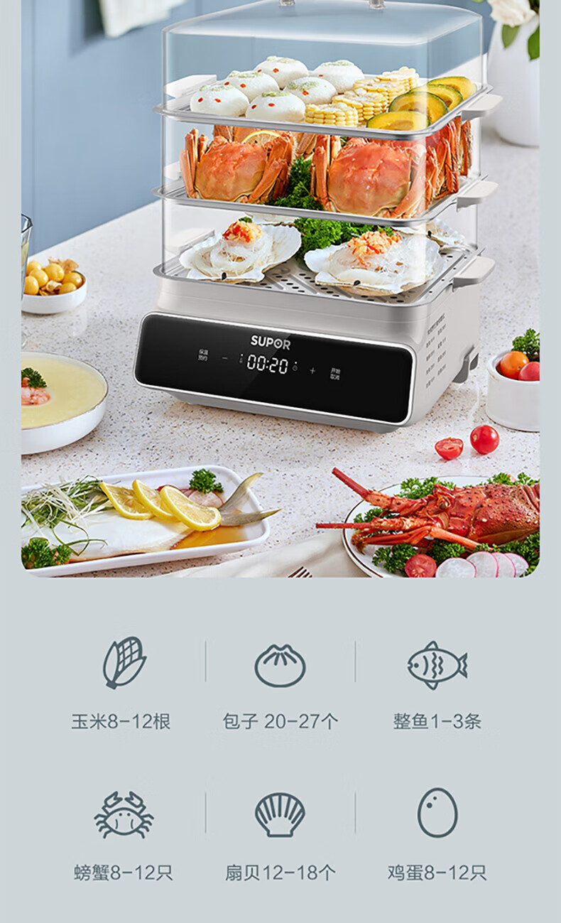 • 商品名称:苏泊尔电蒸锅15.7L大容量家用多功能电蒸笼三层分体式可拆洗智能预约定时蒸锅带蒸盘蒸包子锅ZN26FC32 ZN26FC32/个