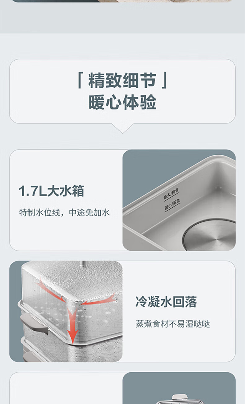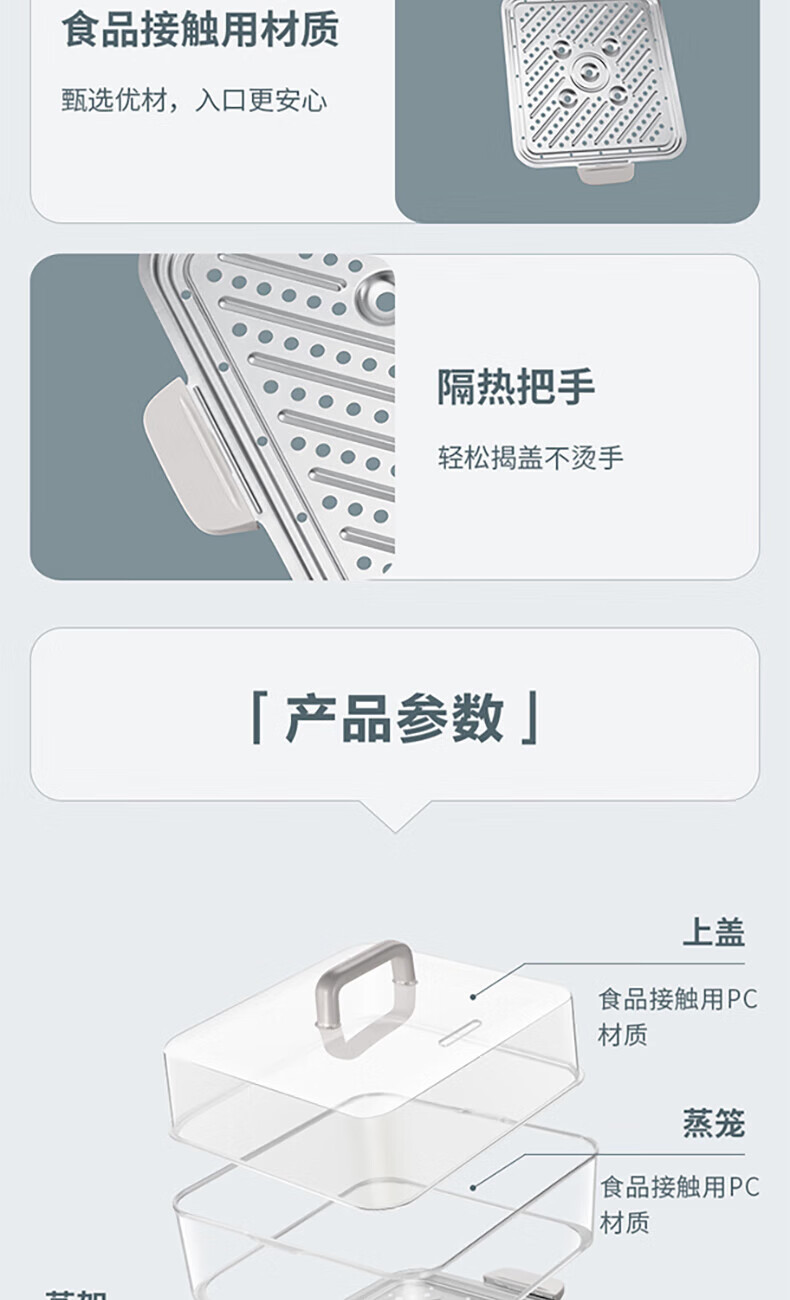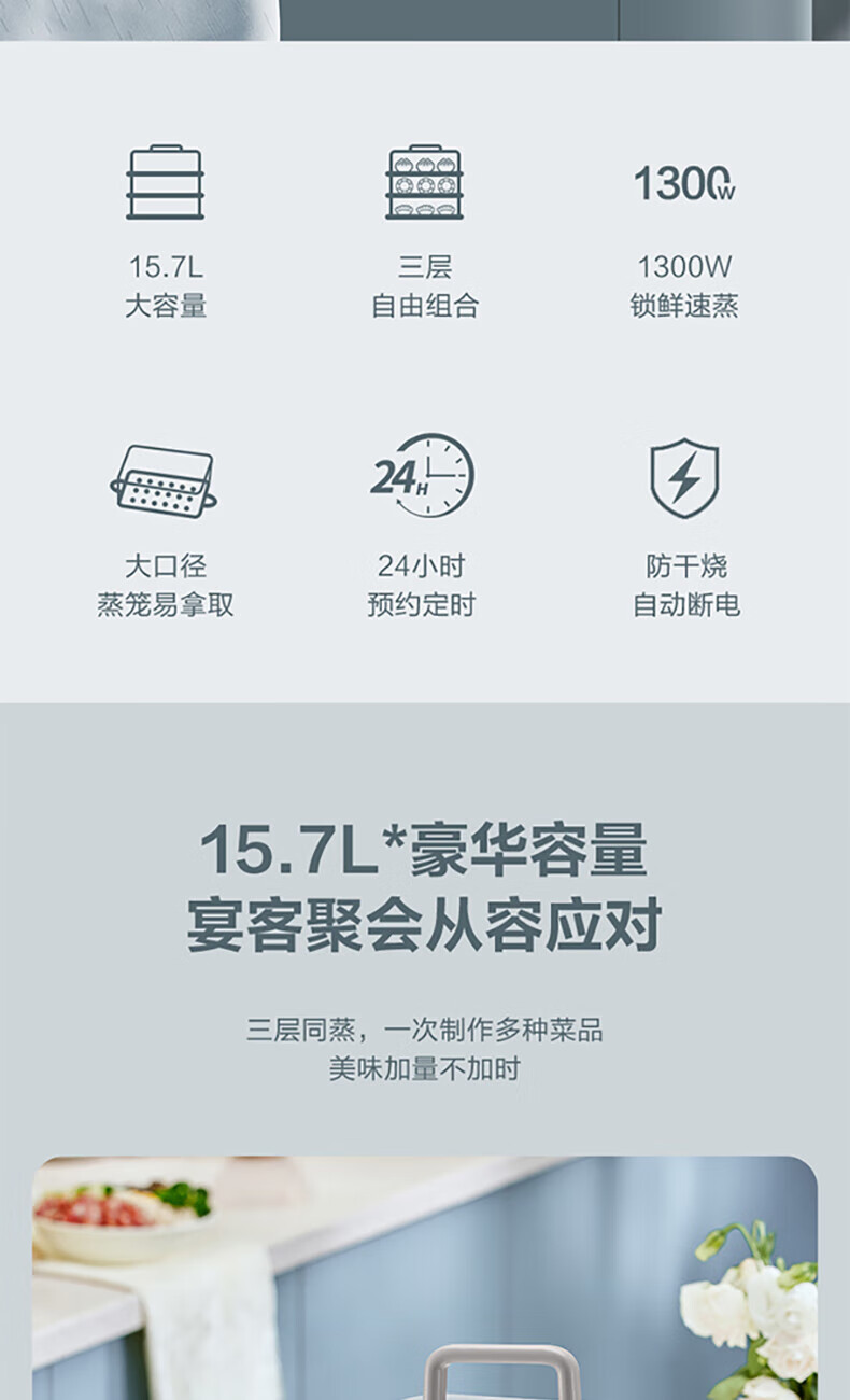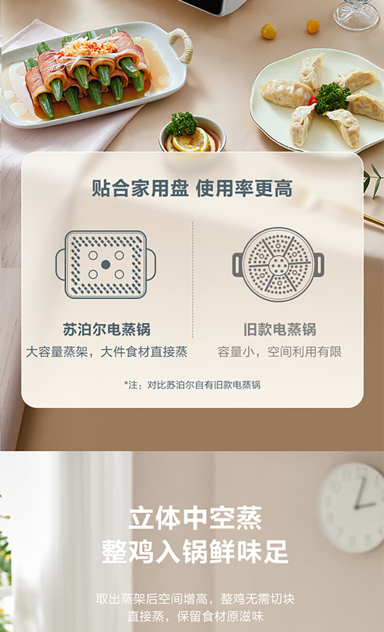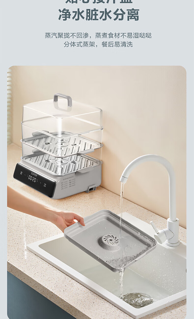 • 商品名称:苏泊尔电蒸锅15.7L大容量家用多功能电蒸笼三层分体式可拆洗智能预约定时蒸锅带蒸盘蒸包子锅ZN26FC32 ZN26FC32/个