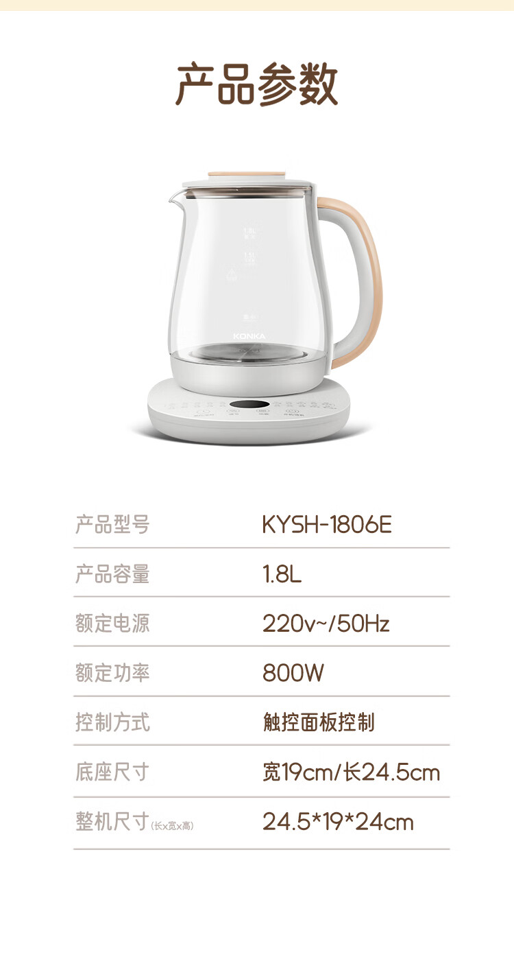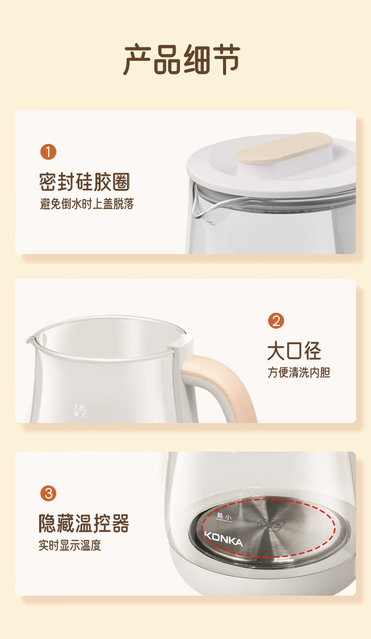 • 商品名称:康佳(KONKA)养生壶KYSH-1806E 煮茶器 玻璃保温烧水壶 1.8L家用大容量 多功能煮花茶 电热水壶 KYSH-1810E/台