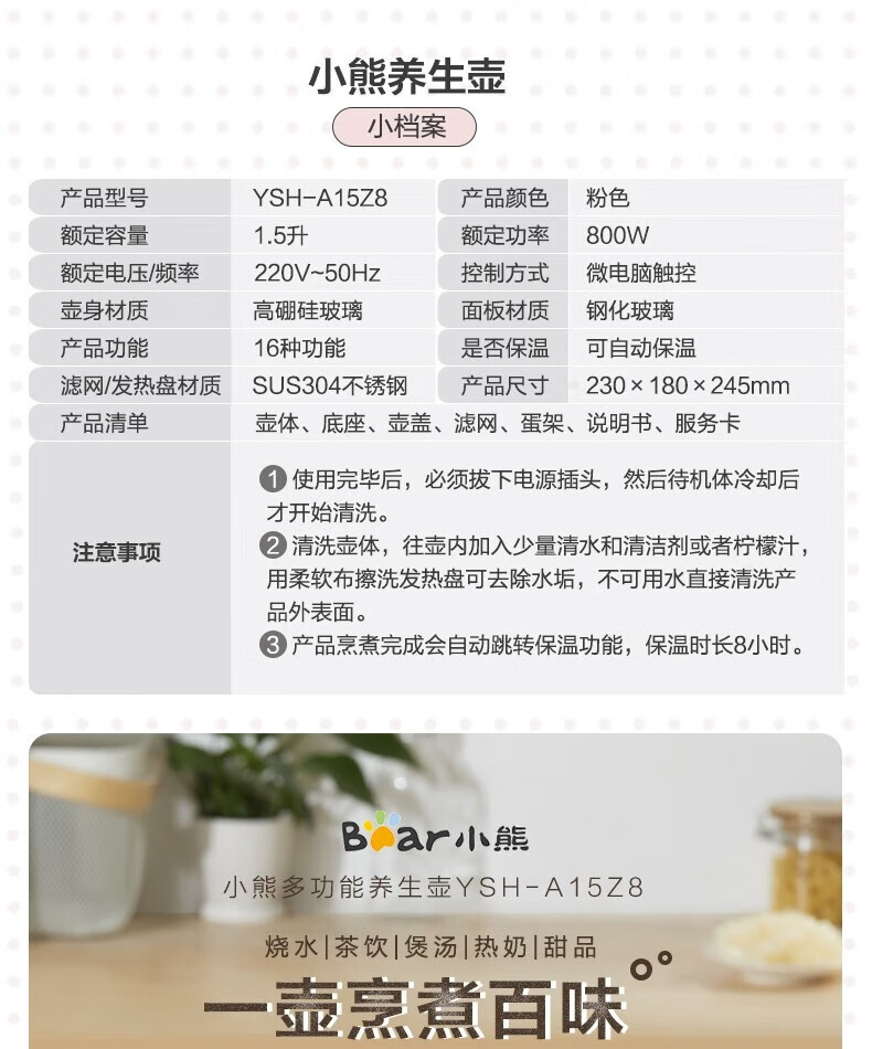 商品名称: 小熊(Bear) 养生壶 煮茶器 煮茶壶电水壶烧水壶1.5L触屏玻璃花茶壶 YSH-A15Z8 触屏调控-钢化玻 YSH-A15Z8/个
