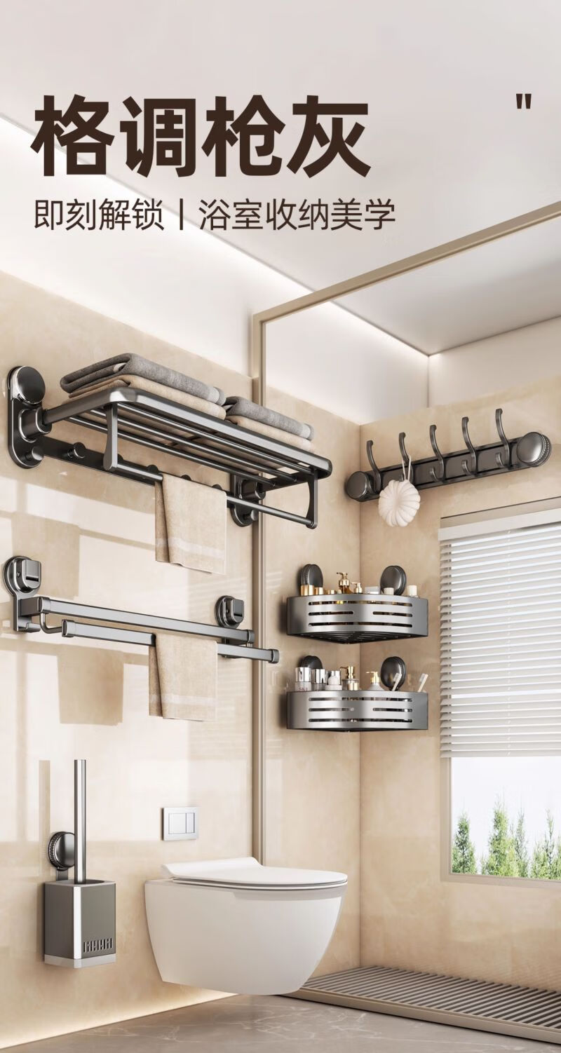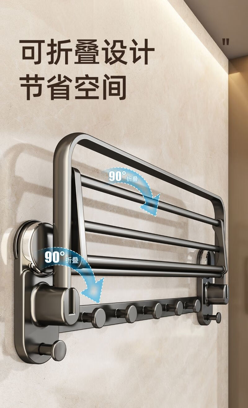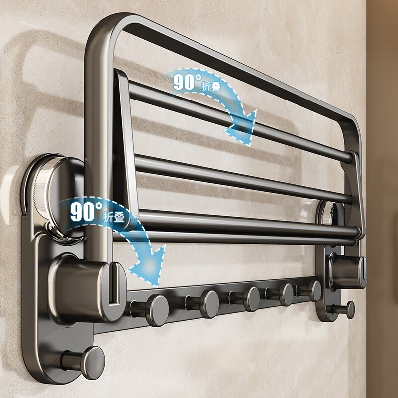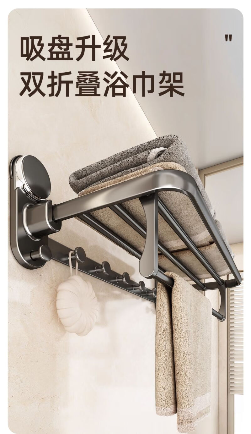 包装清单: 吸盘单折叠挂杆浴巾架带排钩50cm-枪灰色