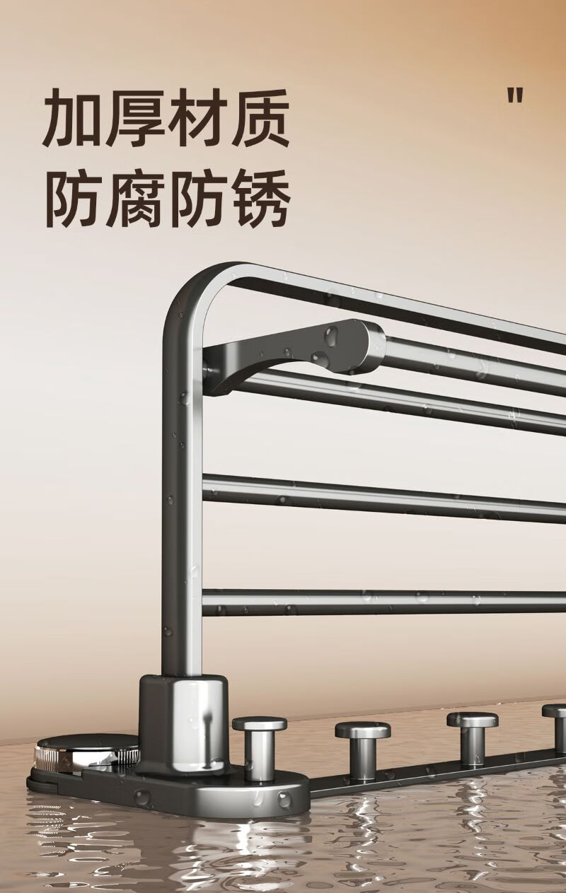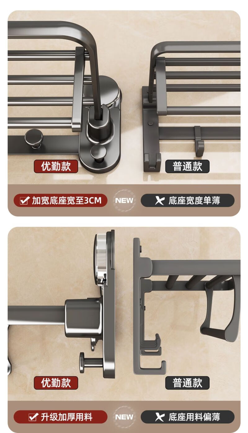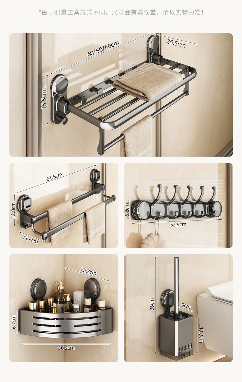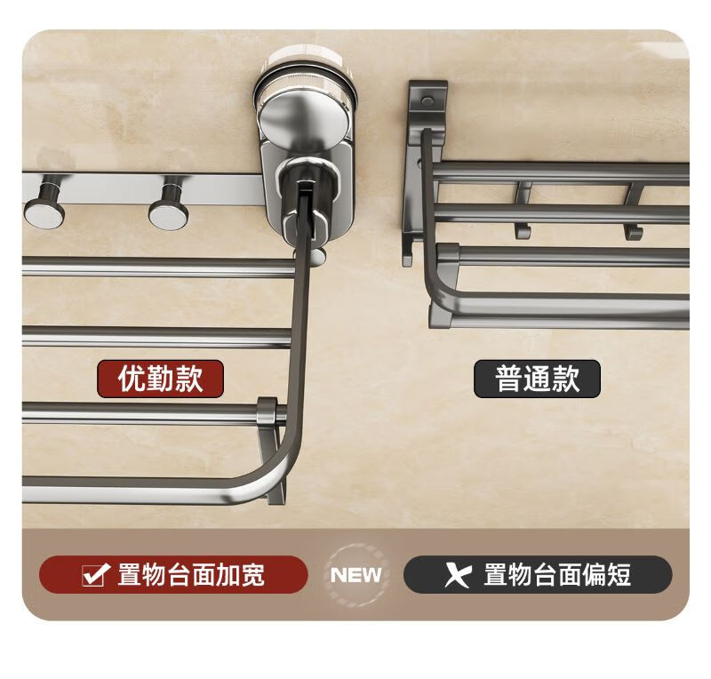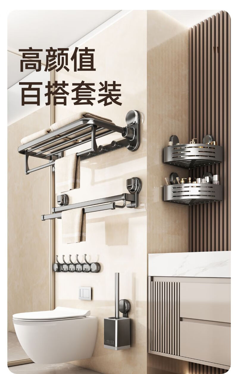 包装清单: 吸盘单折叠挂杆浴巾架带排钩50cm-枪灰色