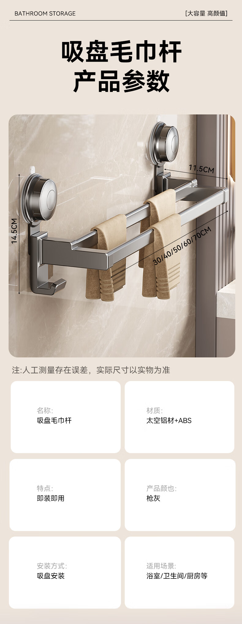 • 商品名称:百悍卫生间吸盘毛巾挂架浴室挂件置物架毛巾架免打孔毛巾杆 G02L166QH/个