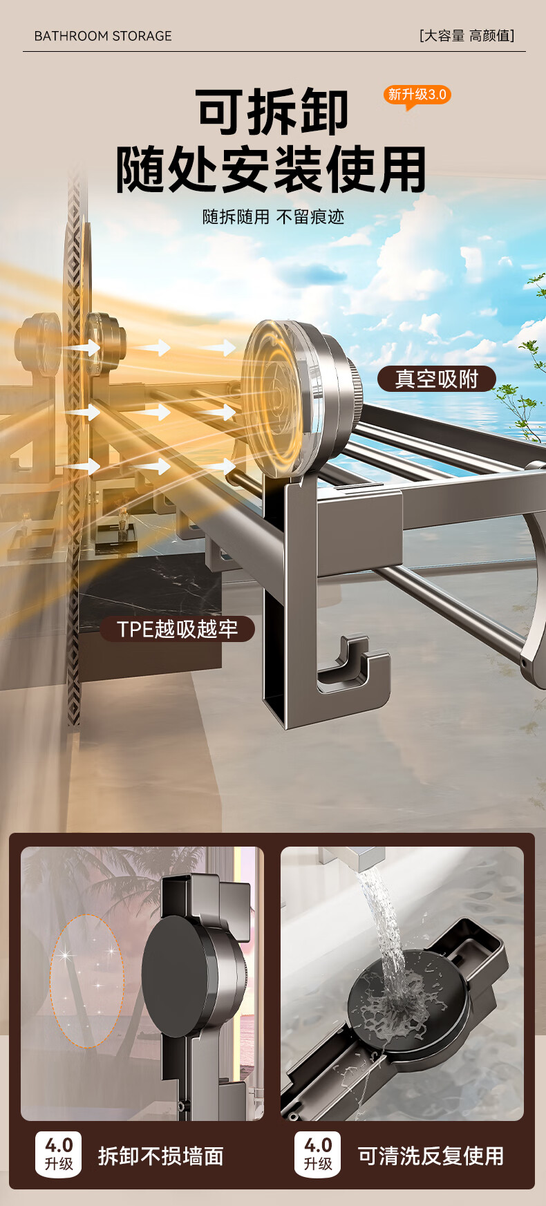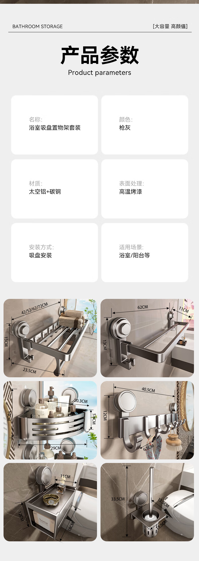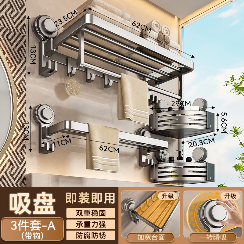 包装清单: 吸盘毛巾架x1 吸盘毛巾双杆x1 吸盘三角篮x2