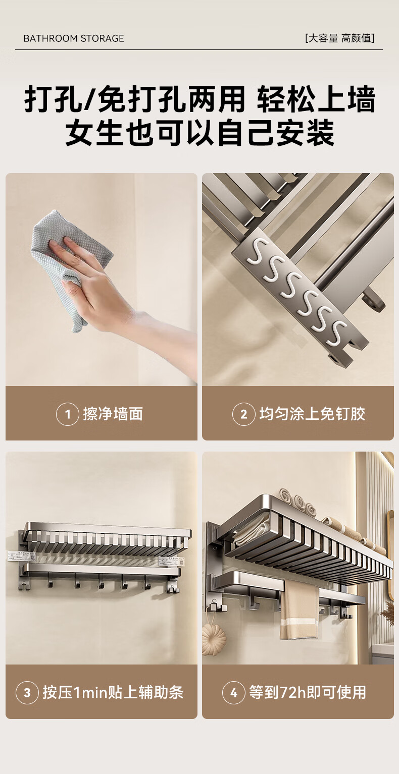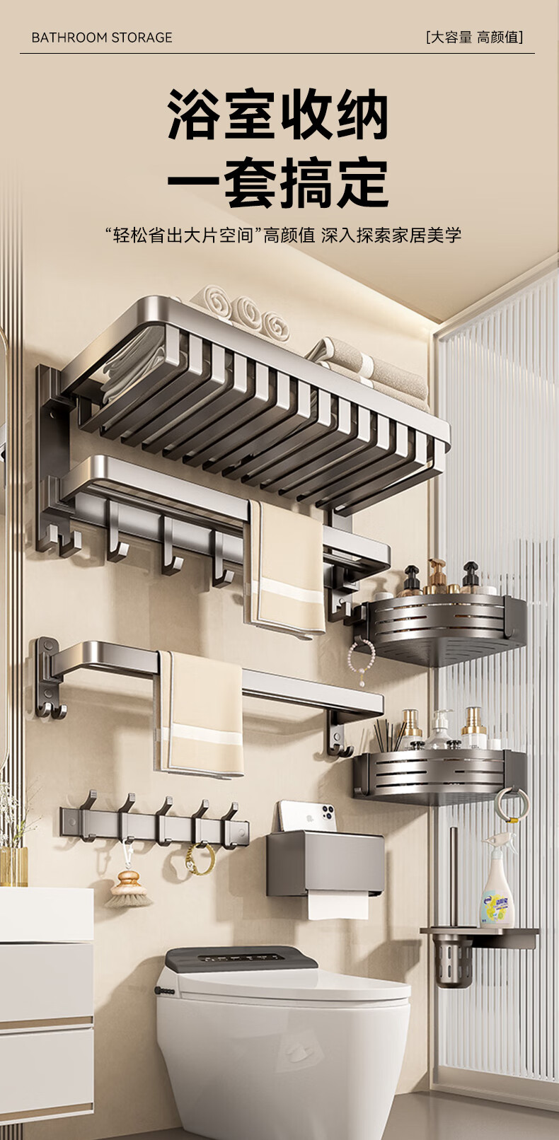 • 商品名称:百悍毛巾架免打孔卫生间置物架浴室挂件厕所浴巾架套装卫浴洗手间收纳 GLL0122QH/件