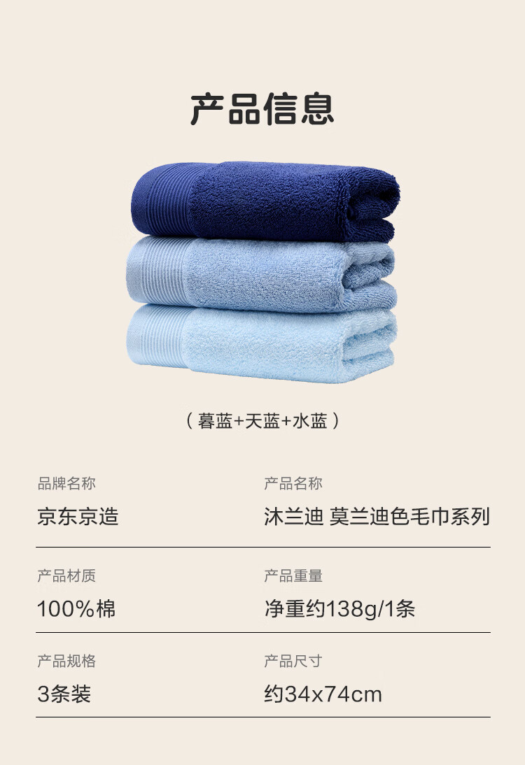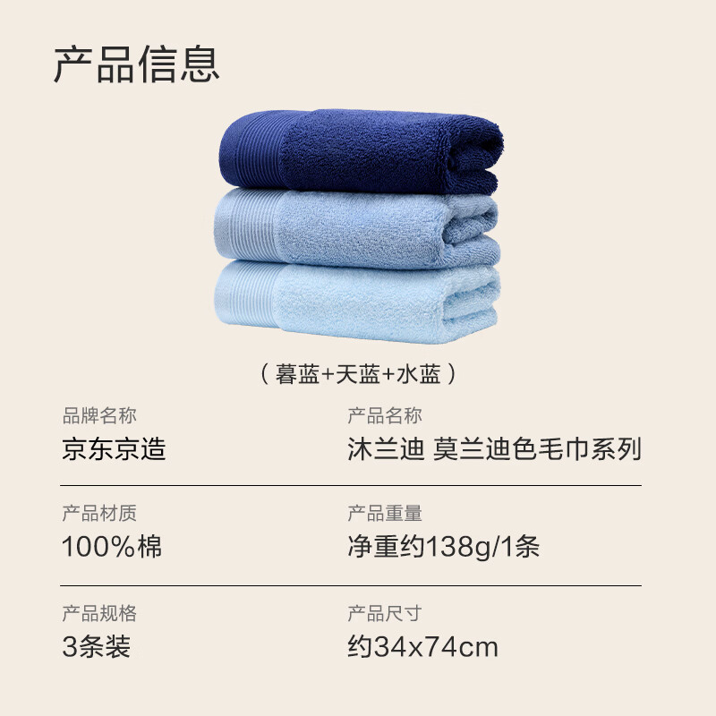 商品名称: 京东京造138g加厚沐兰迪毛巾 阿瓦提长绒棉7A抗菌纯棉 3条 暮蓝+天蓝+水蓝 沐兰迪色3条装暮蓝+天蓝+水蓝/袋
