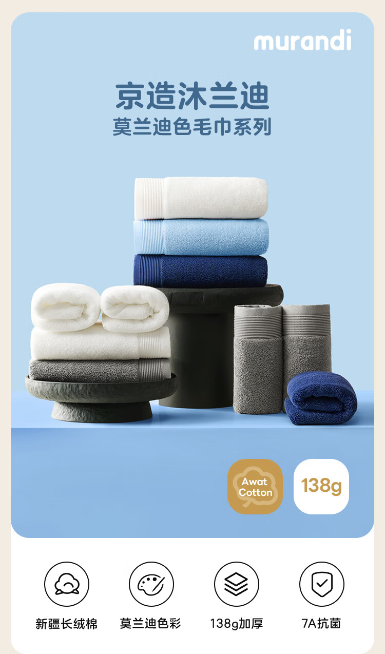 • 商品名称:京东京造138g加厚沐兰迪毛巾 阿瓦提长绒棉7A抗菌纯棉 3条 暮蓝+天蓝+水蓝 沐兰迪色3条装暮蓝+天蓝+水蓝/袋