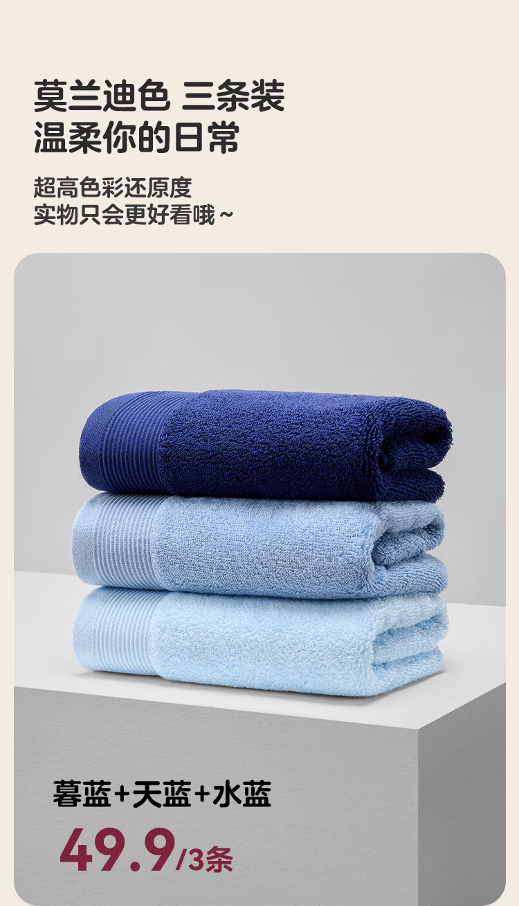 京东京造138g加厚沐兰迪毛巾 阿瓦提长绒棉7A抗菌纯棉 3条 暮蓝+天蓝+水蓝 沐兰迪色3条装暮蓝+天蓝+水蓝/袋